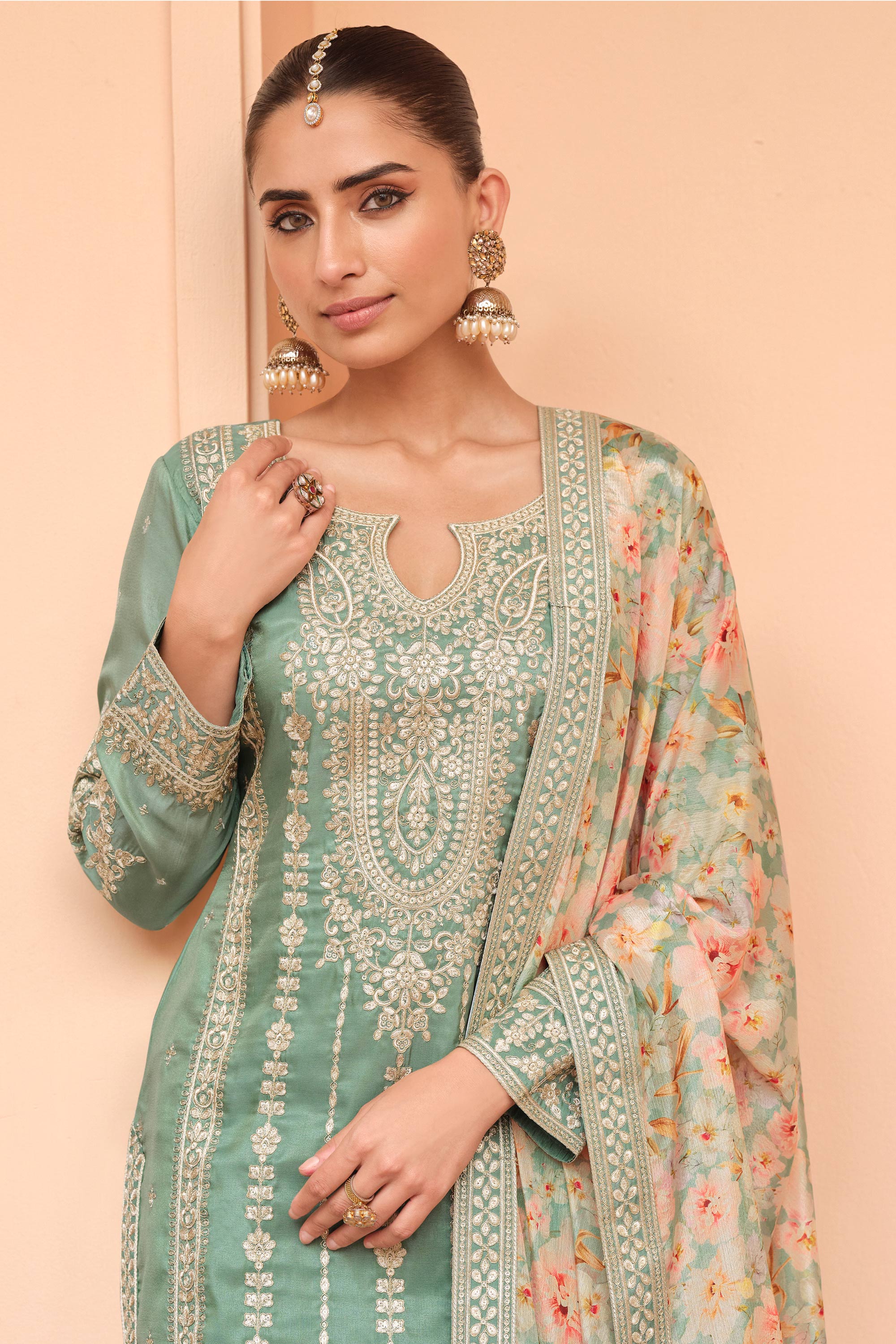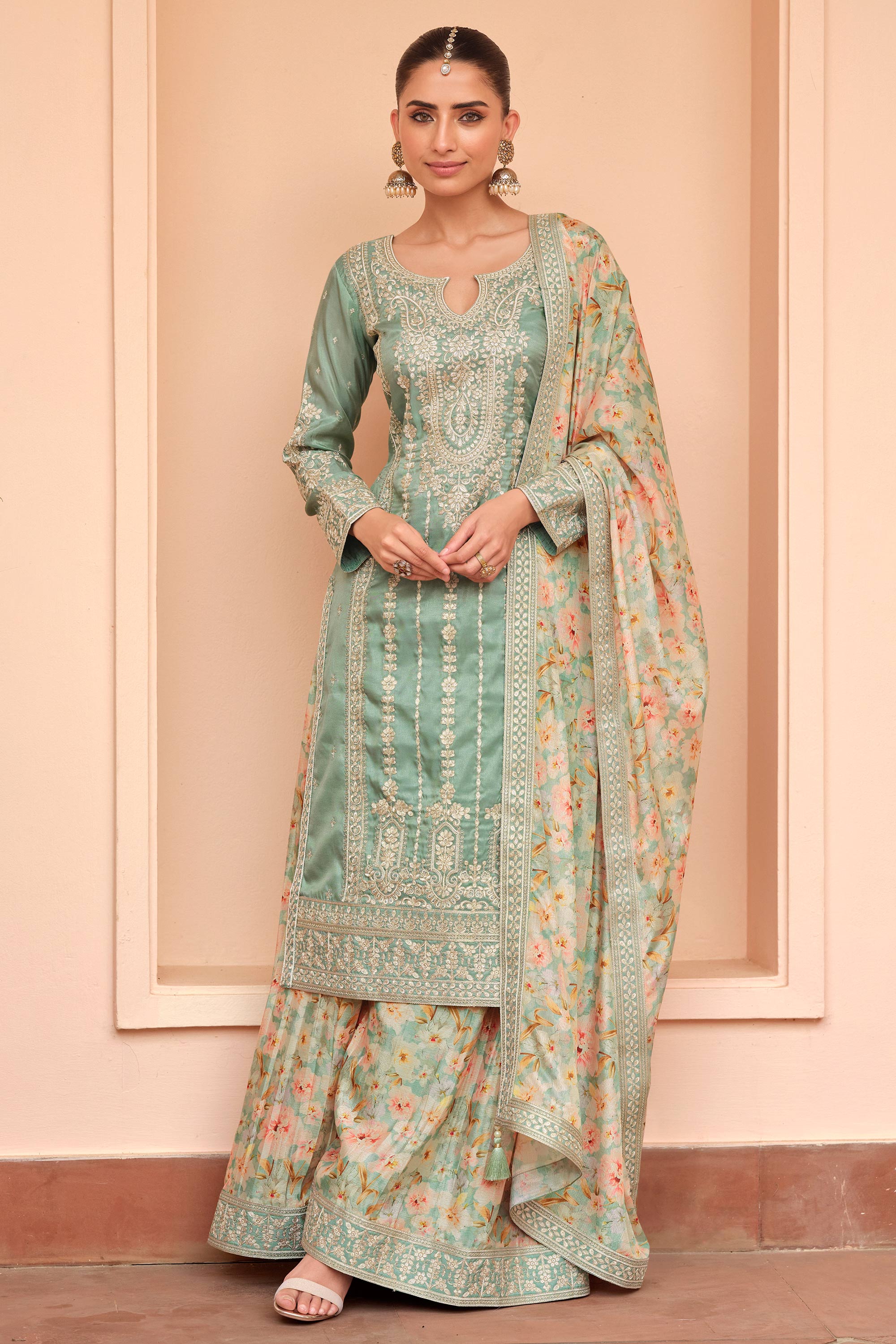 Elevate your style with the Art Silk Embroidered Designer Sharara Style Palazzo Salwar Kameez. Crafted with fine attention to detail, this outfit showcases intricate embroidery on luxurious art silk fabric. The sharara-style palazzo pants add a graceful touch, making it a perfect choice for festive occasions, weddings, or traditional gatherings. Designed for both comfort and elegance, it combines modern fashion with a timeless cultural appeal. Available in multiple sizes and vibrant colors, this ensemble ensures you stand out in any crowd. Add it to your wardrobe today for a sophisticated, chic look that’s truly one of a kind.