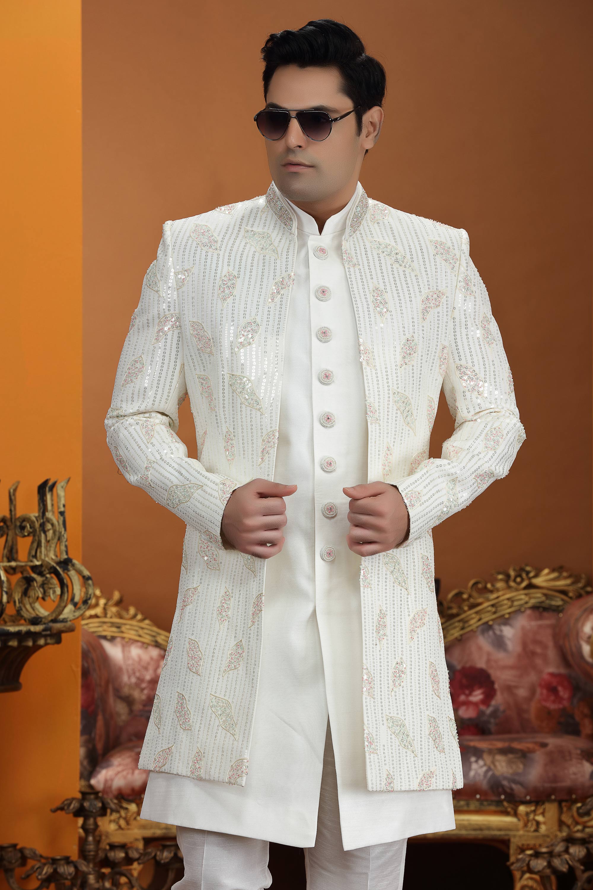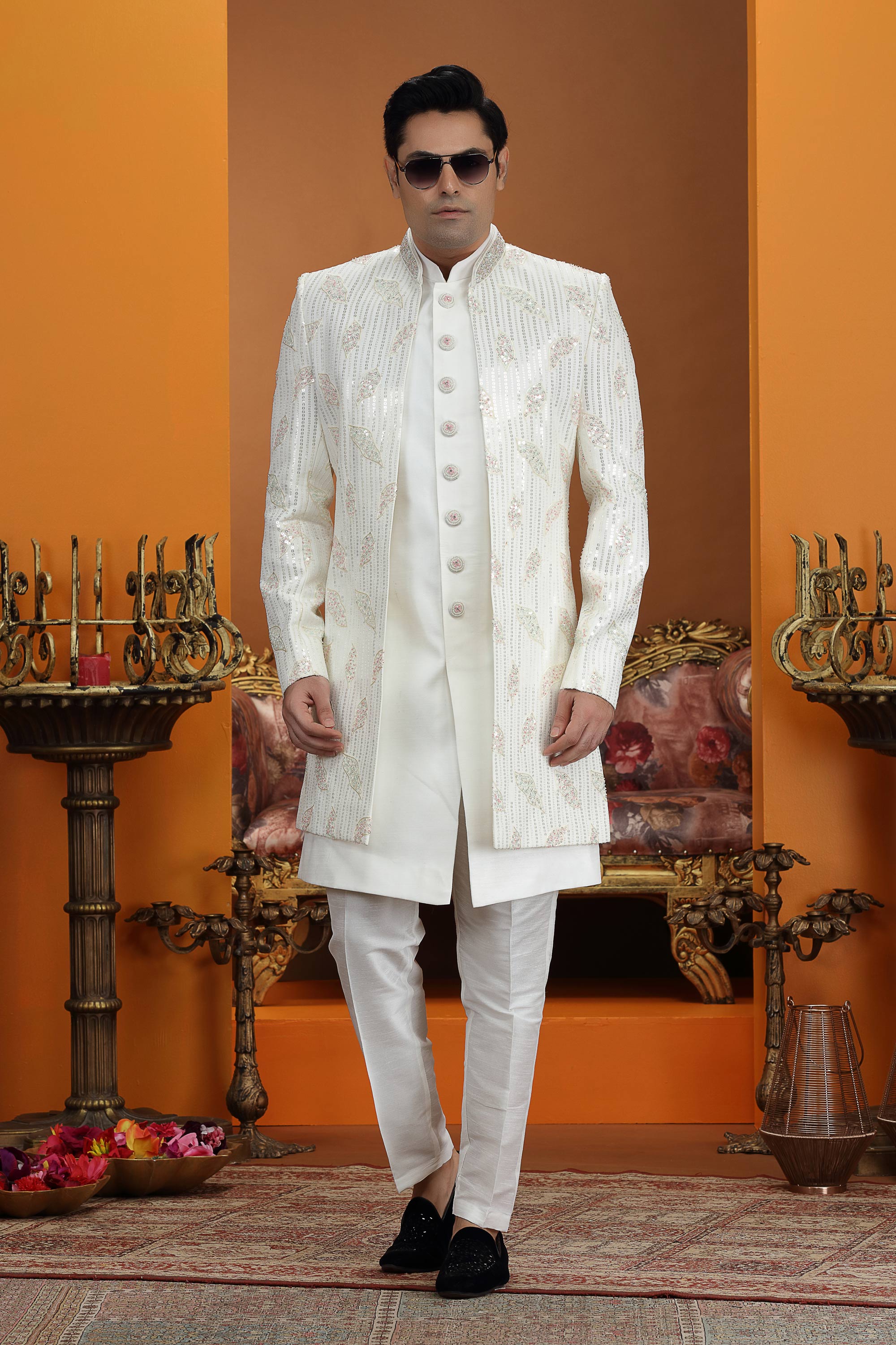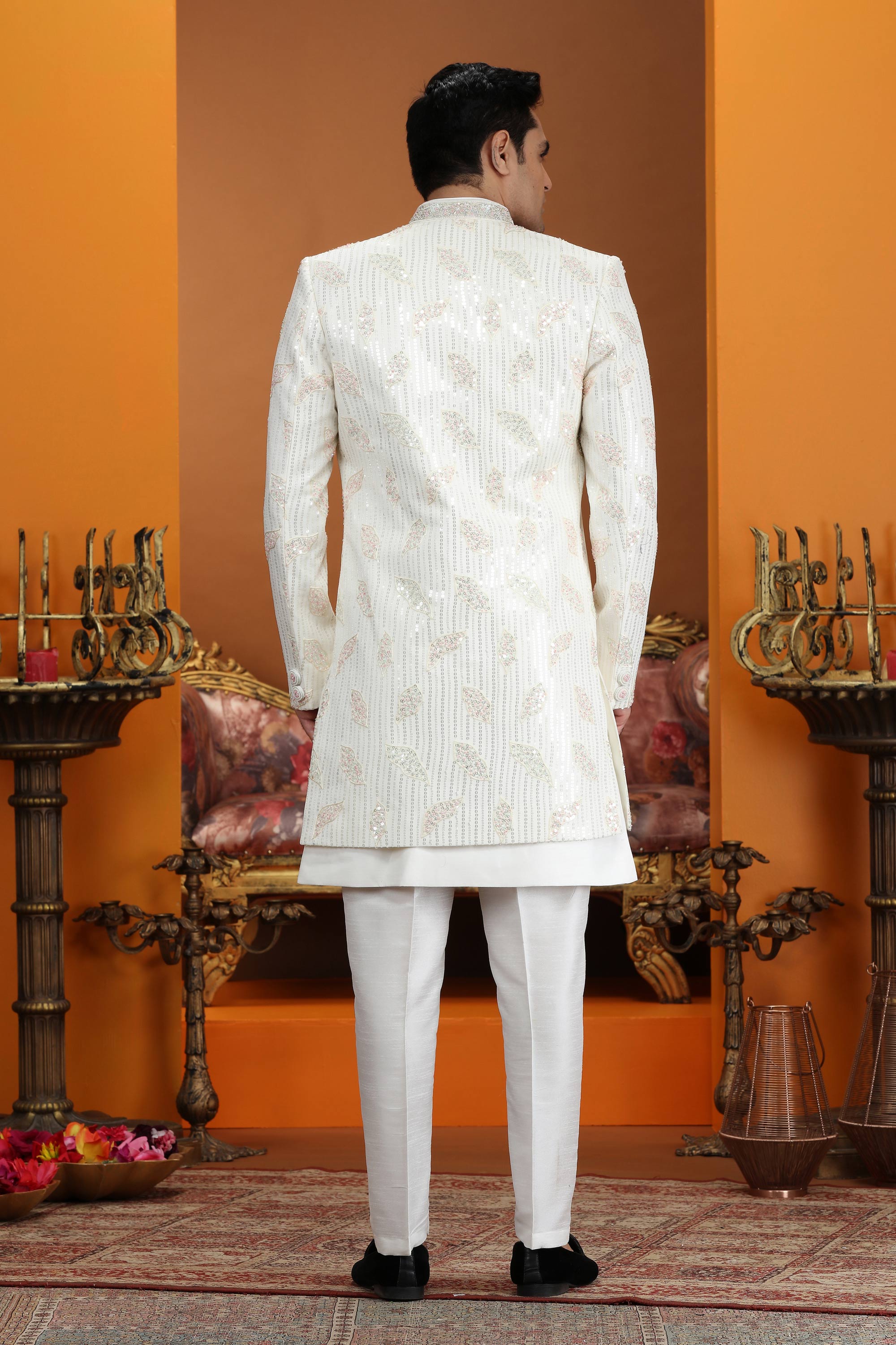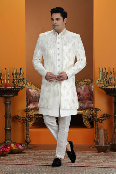 Embroidered Art Silk Cream Readymade Indo Western For Wedding Wear