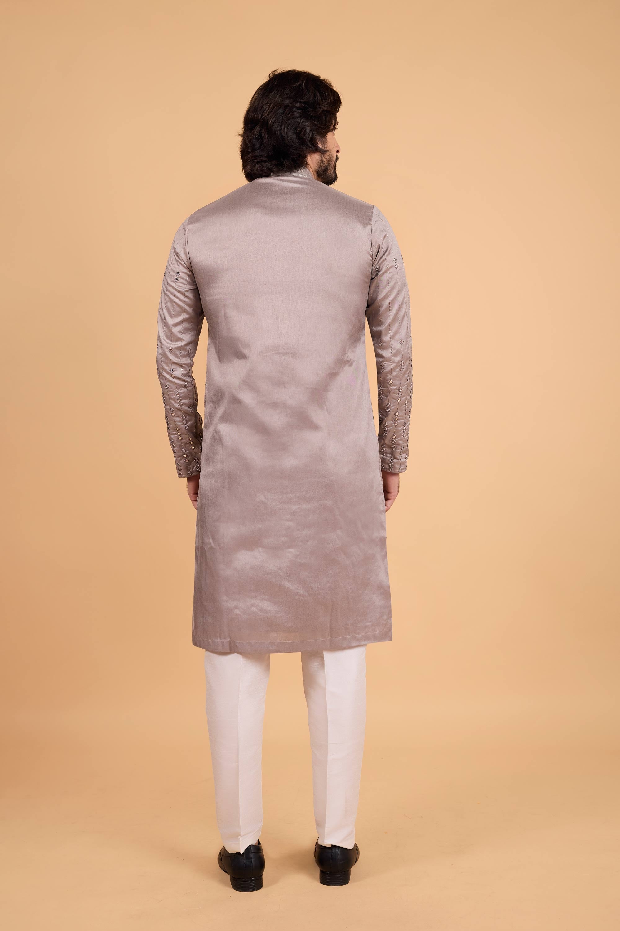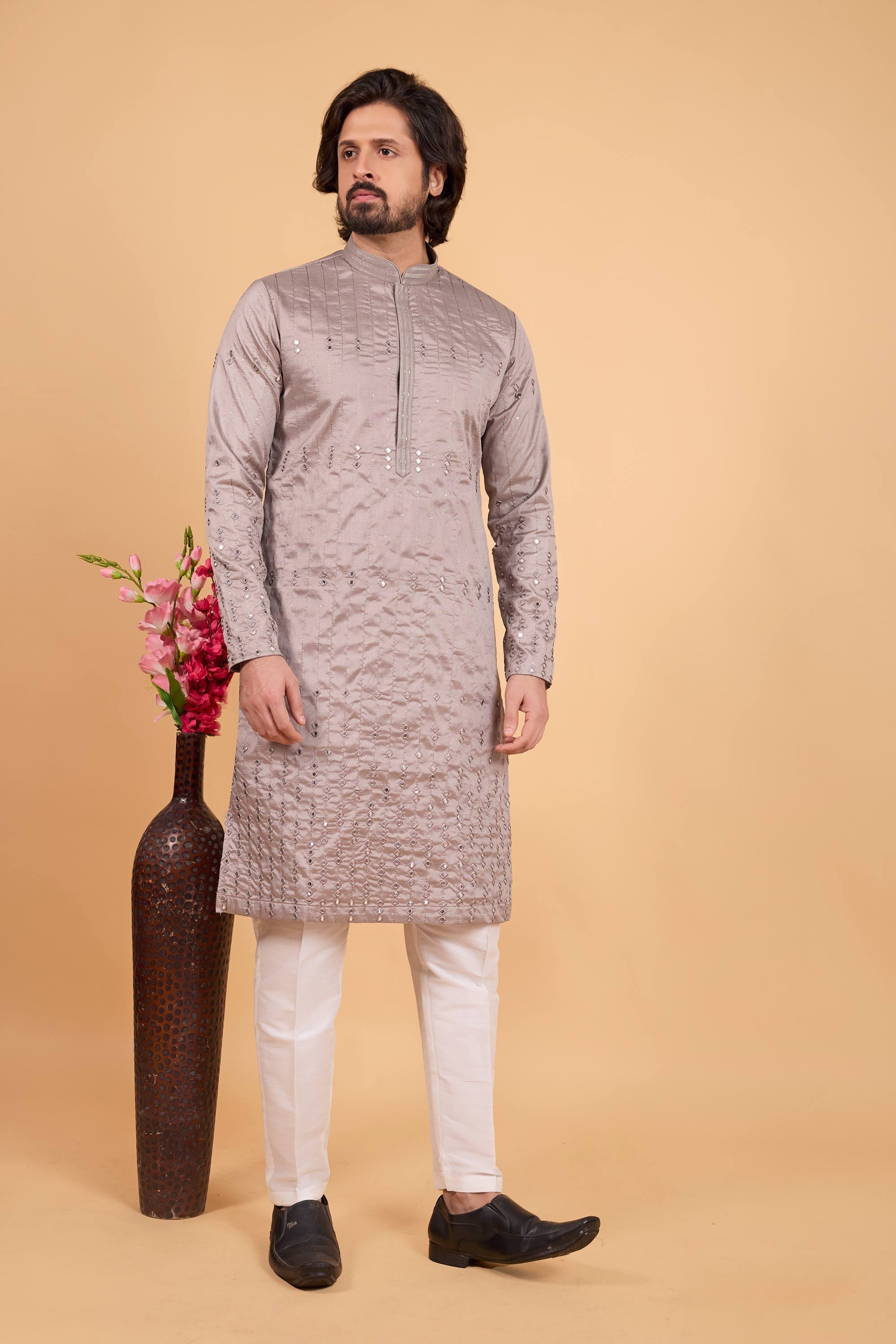 Embroidered Art Silk Dark Beige Festive Wear Kurta Pyjama For Men