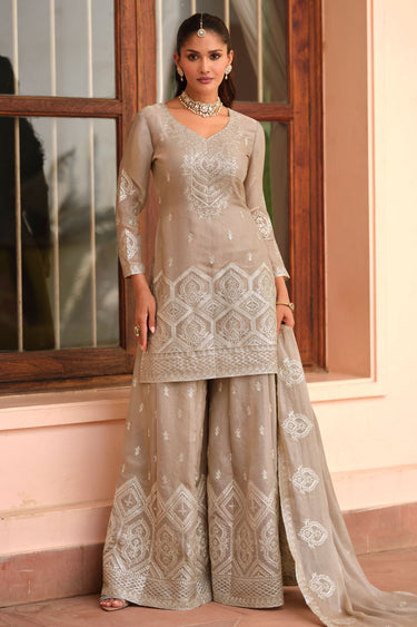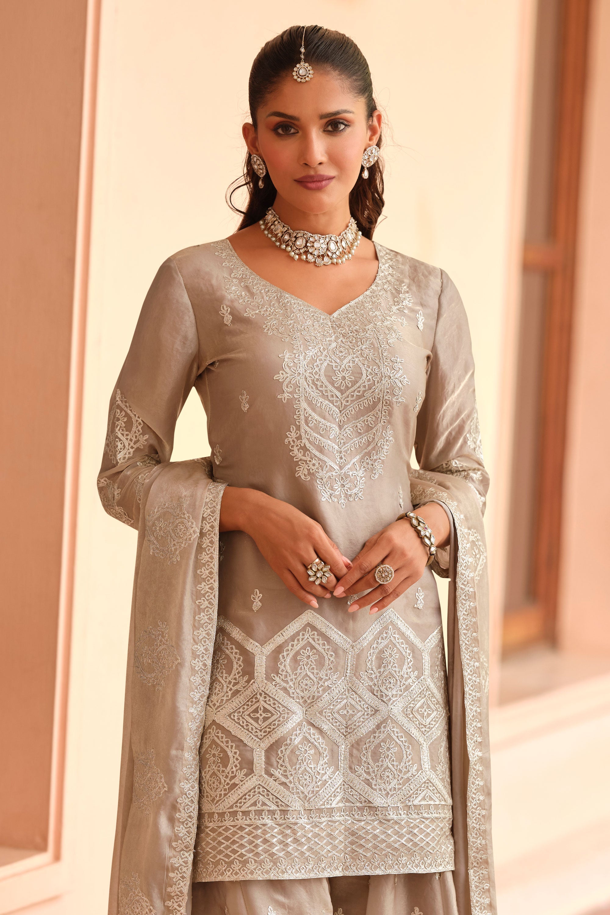 Embroidered Art Silk Dark Beige Readymade Palazzo Suit