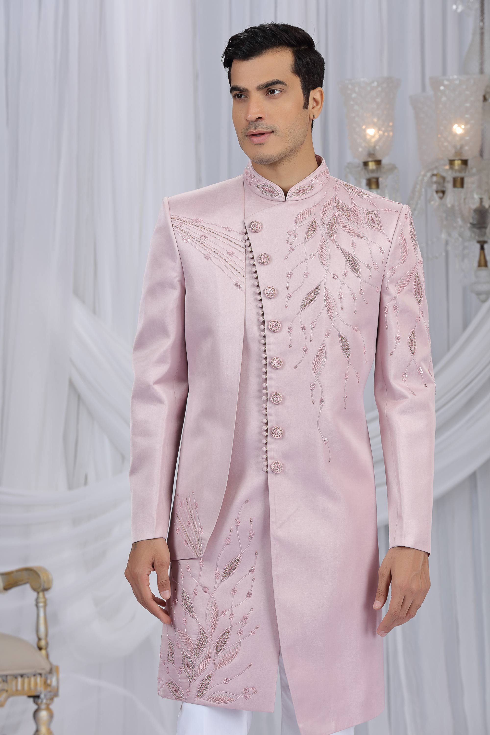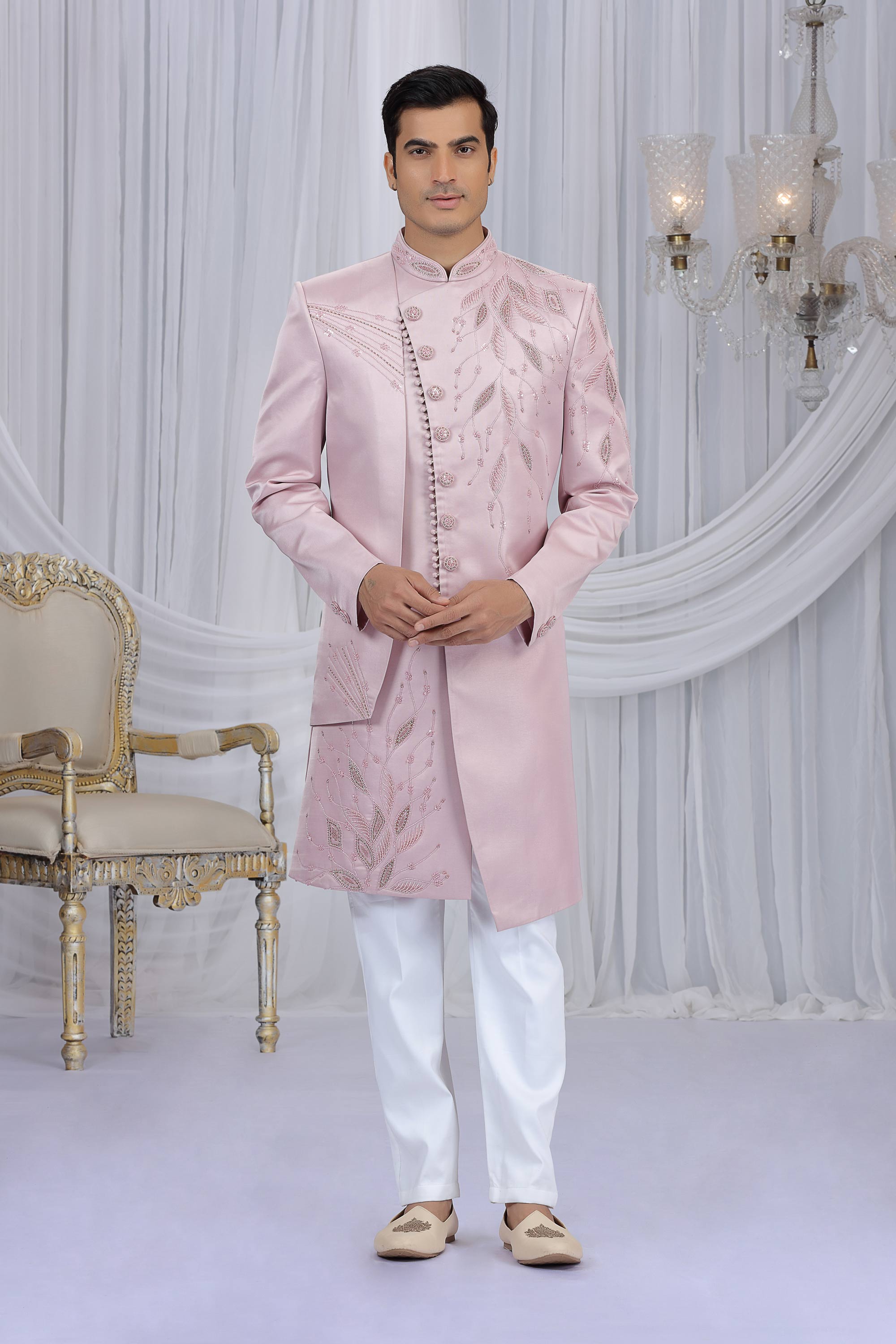 Embroidered Art Silk Pink Readymade Indo Western For Men