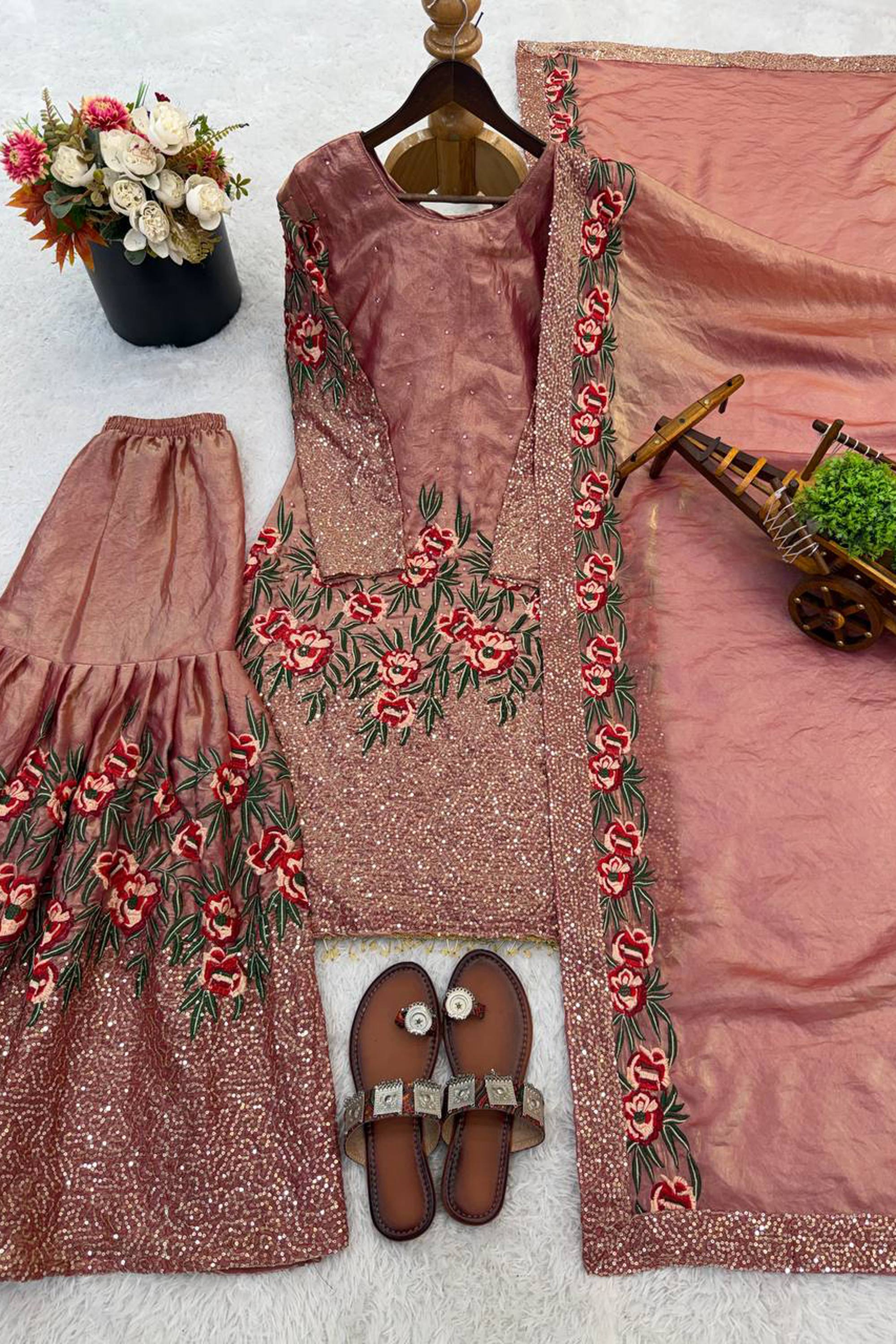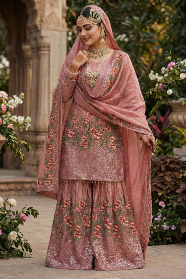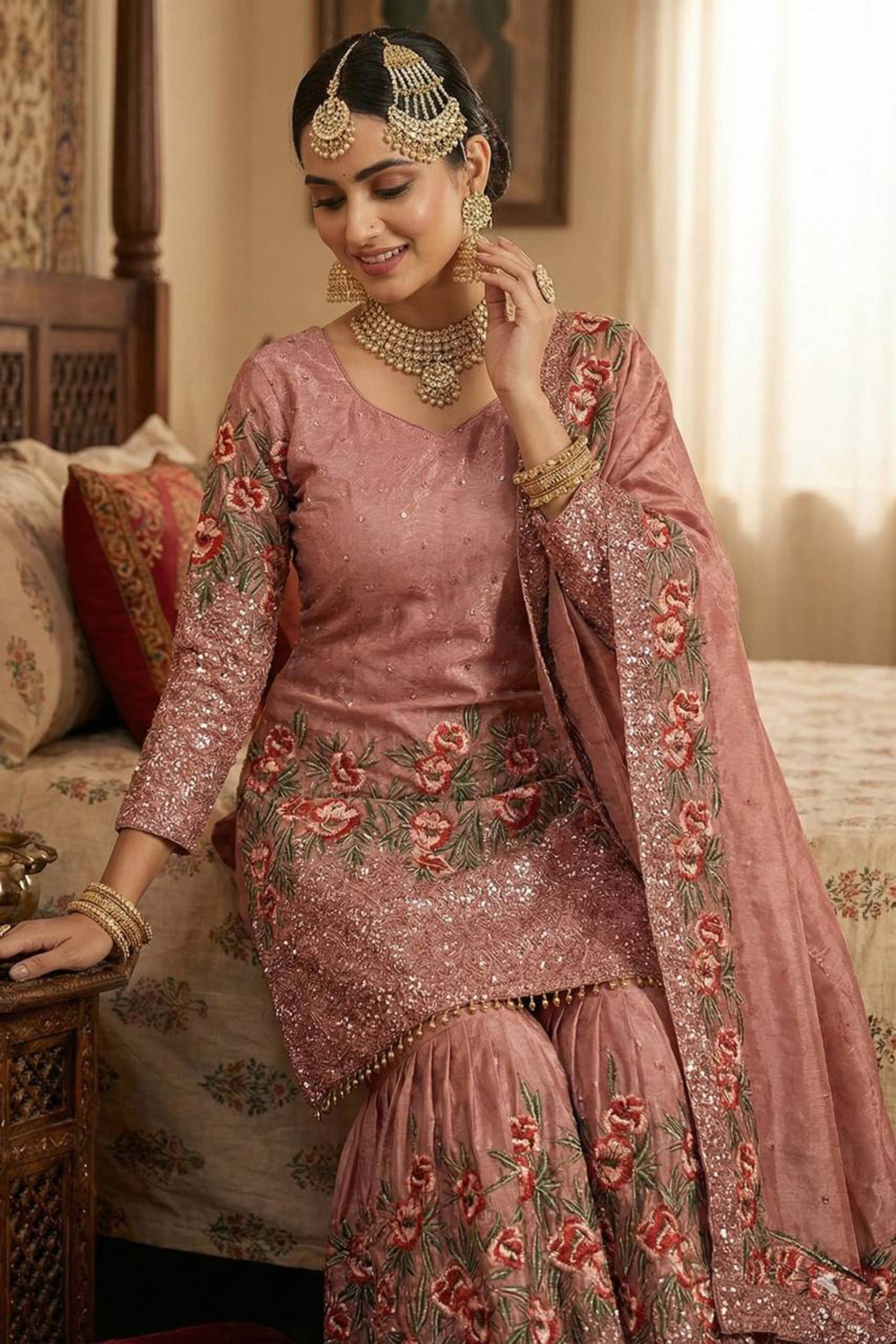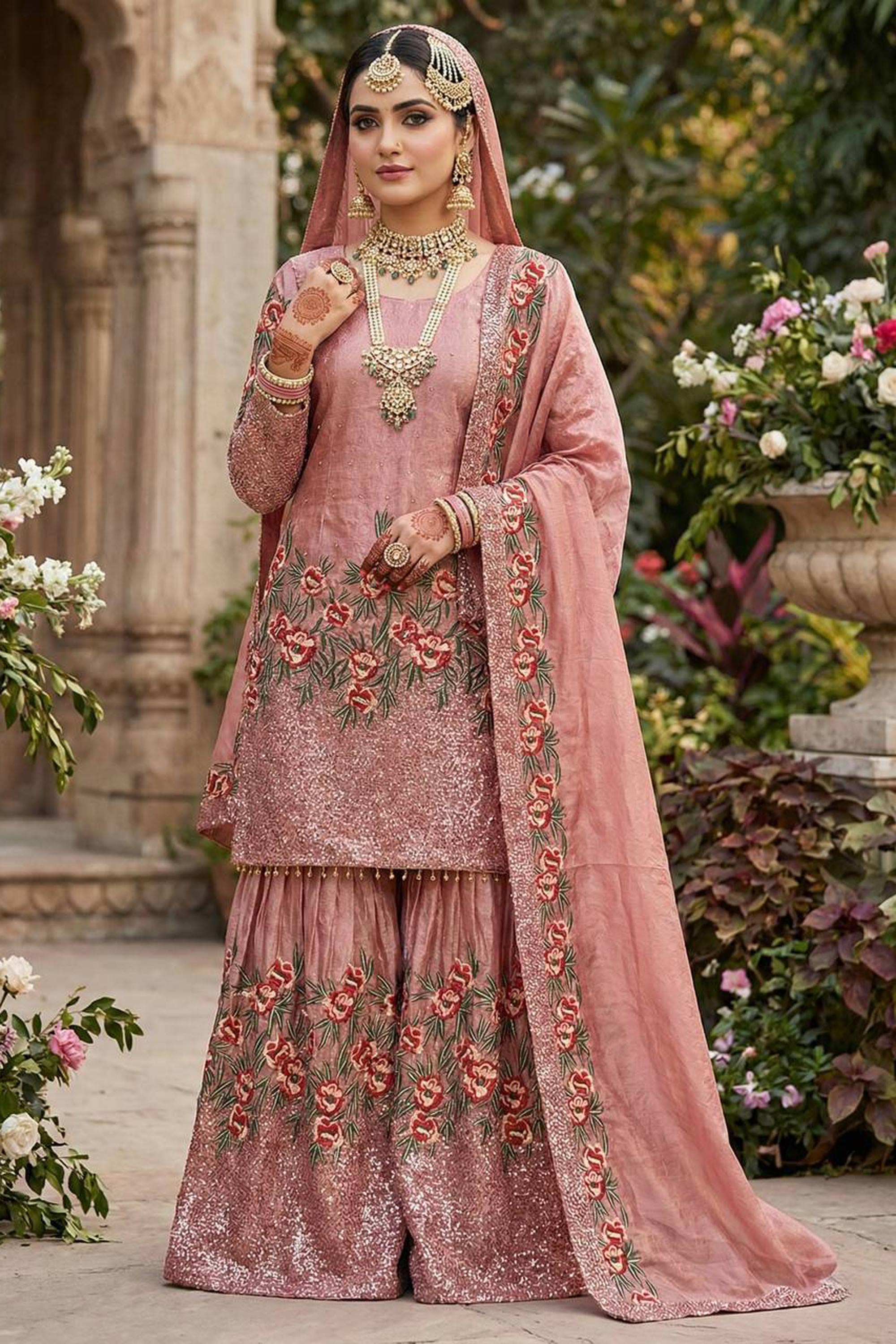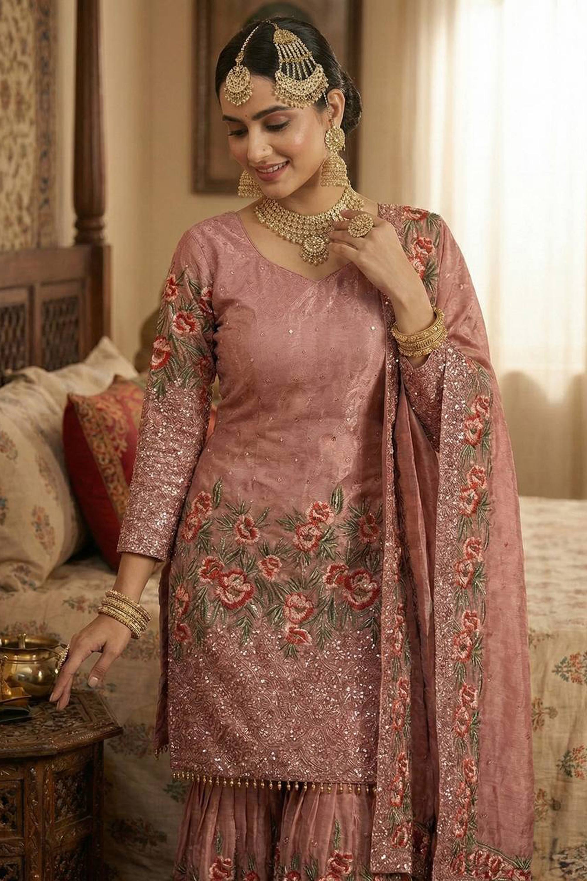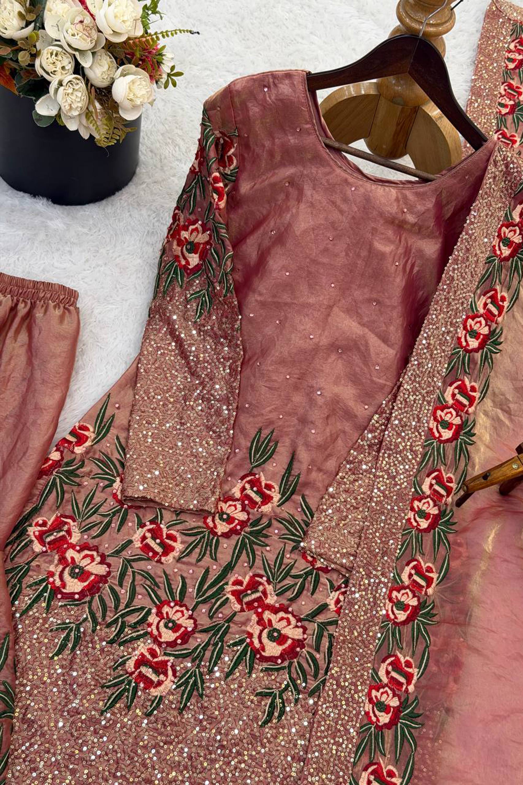 Embroidered Art Silk Pink Readymade Palazzo Suit For Function Wear