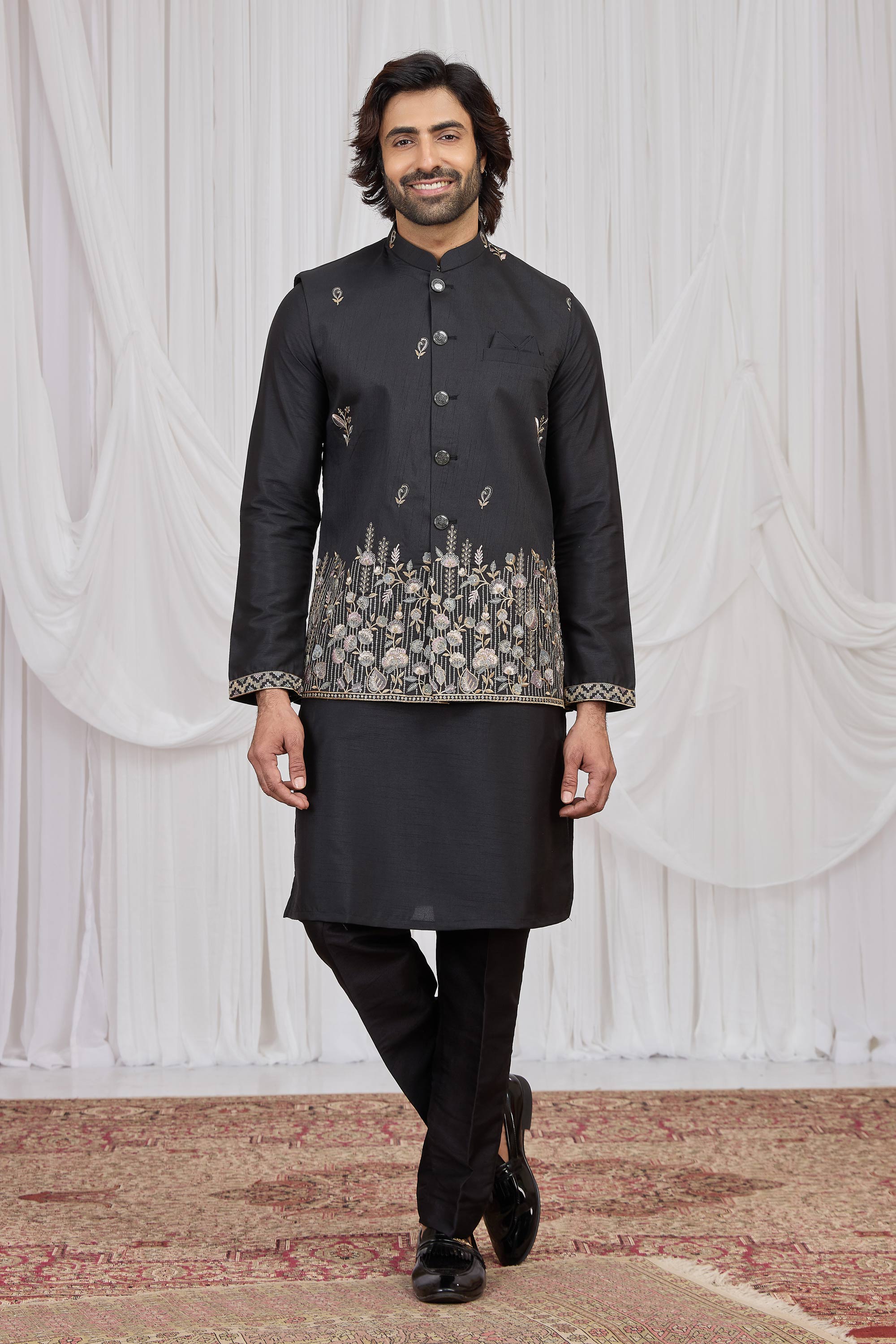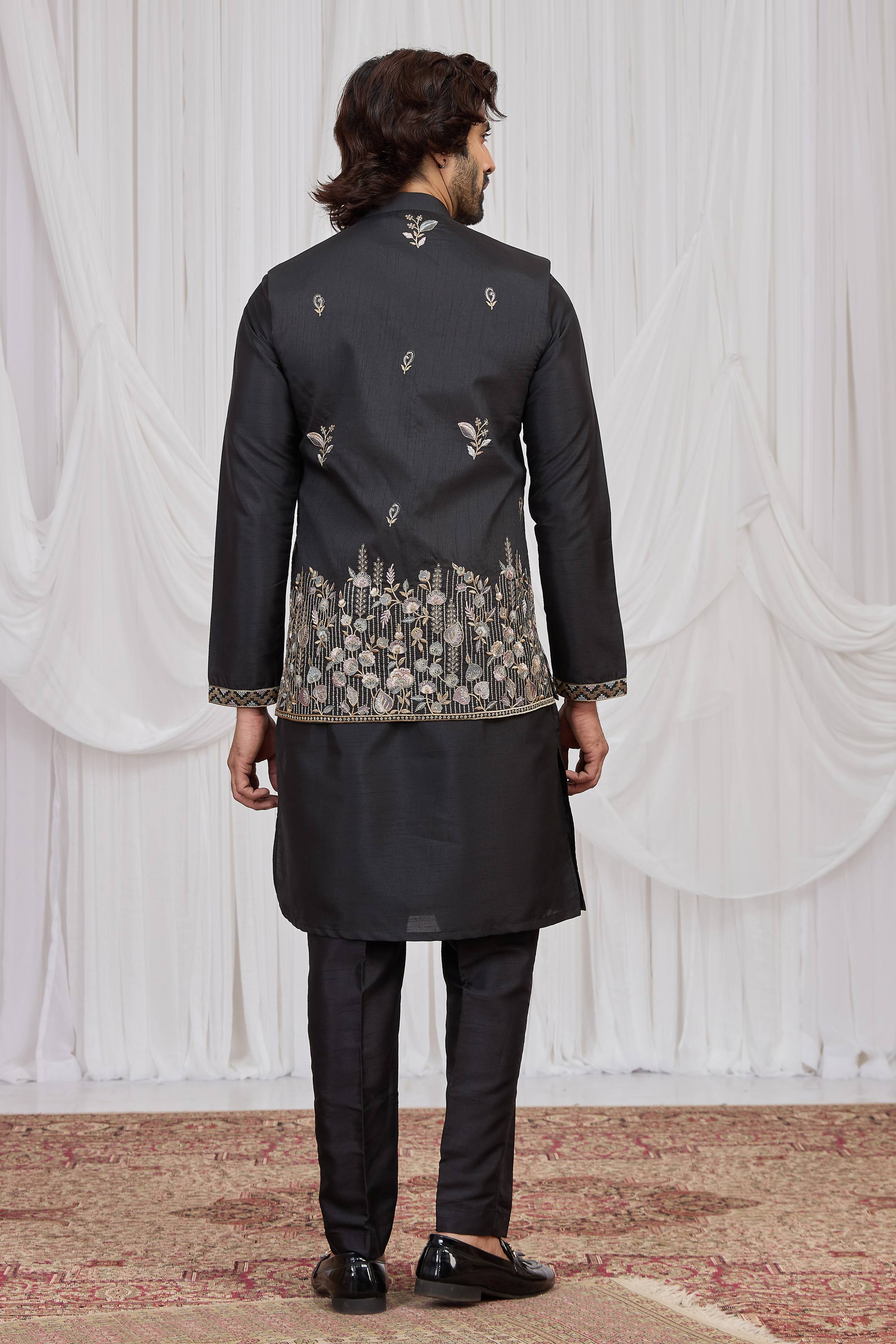 Embroidered Black Sangeet Wear Readymade Kurta Pyjama With Jacket For Men