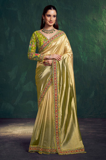 Embroidered Border Work Tissue Silk Beige Saree For Wedding Wear
