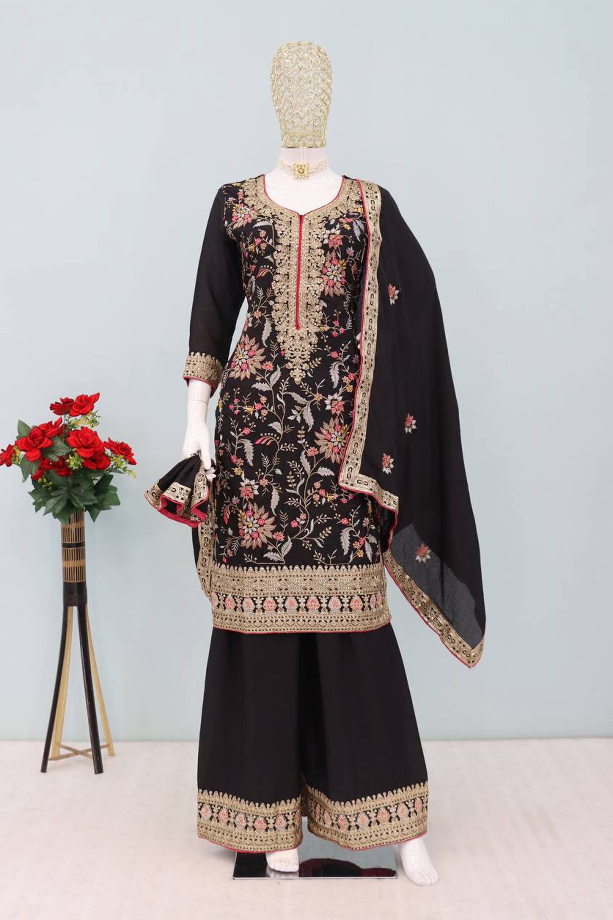 Embroidered Chinon Black Function Wear Readymade Palazzo Suit