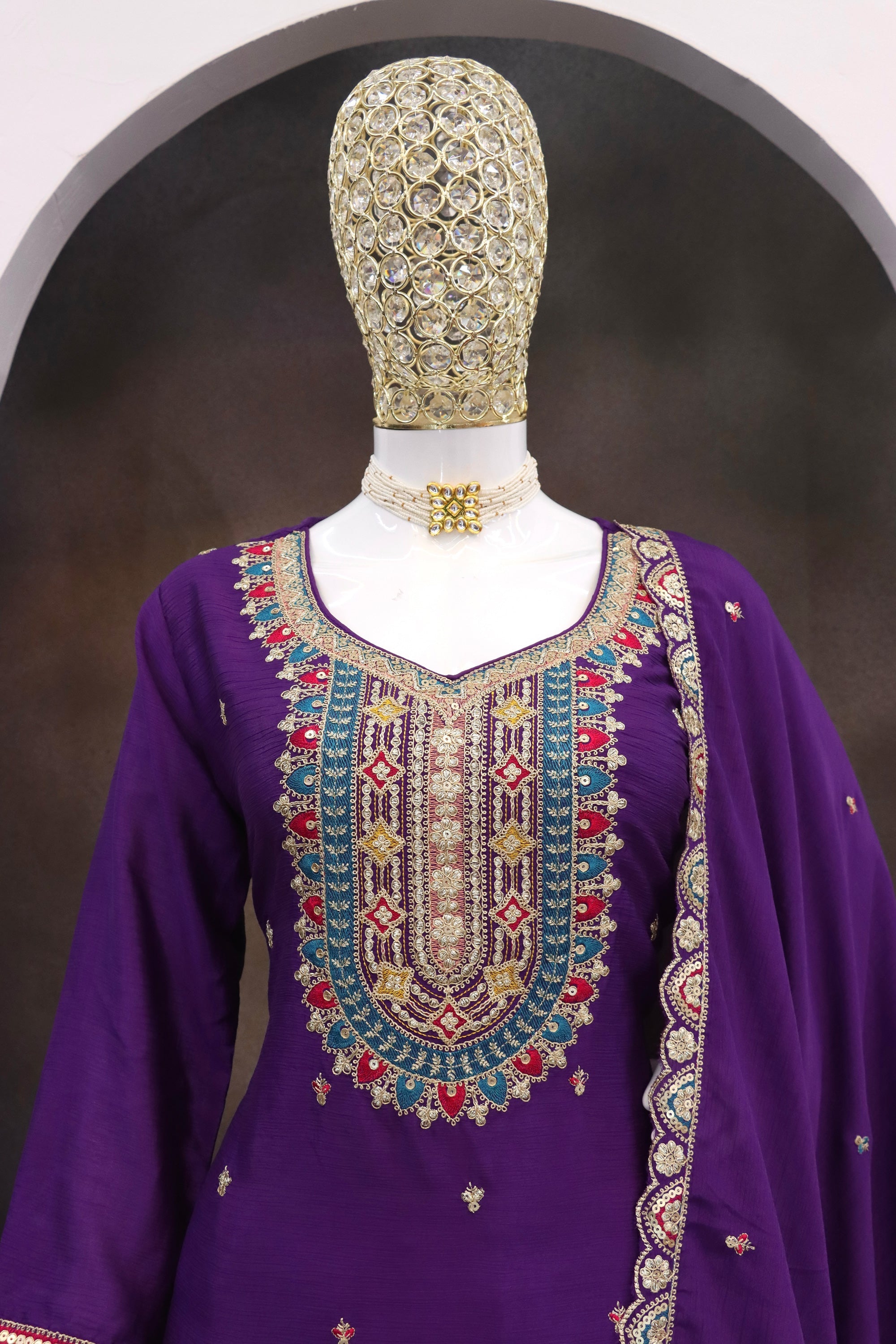 Embroidered Chinon Purple Designer Readymade Palazzo Salwar Kameez