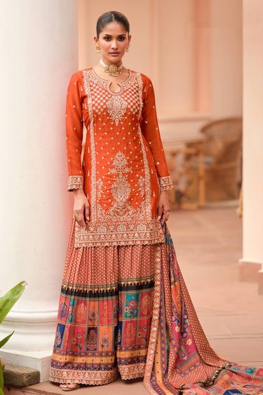 Embroidered Chinon Silk Rust Wedding Wear Readymade Palazzo Suit With Dupatta