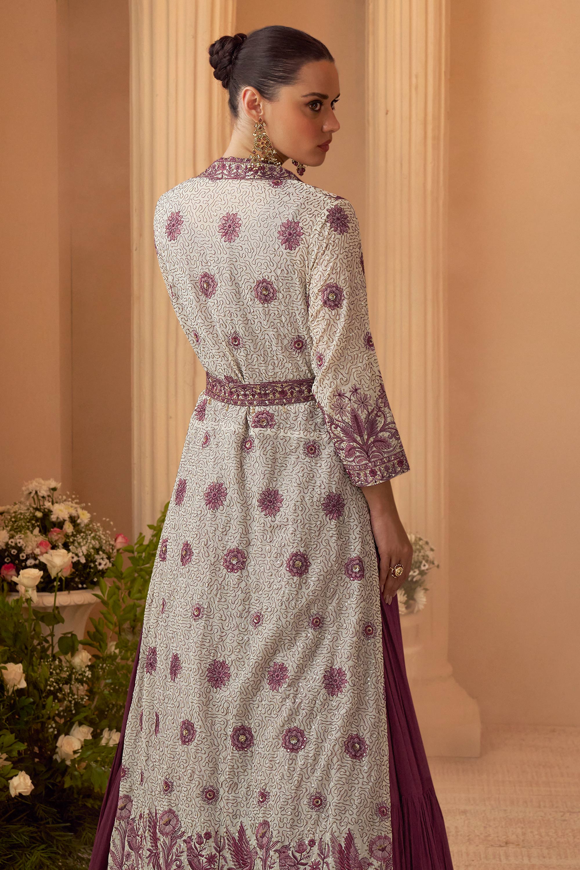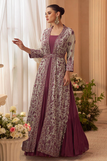 Embroidered Chinon Wine Floor Touch Gown With Long Jacket
