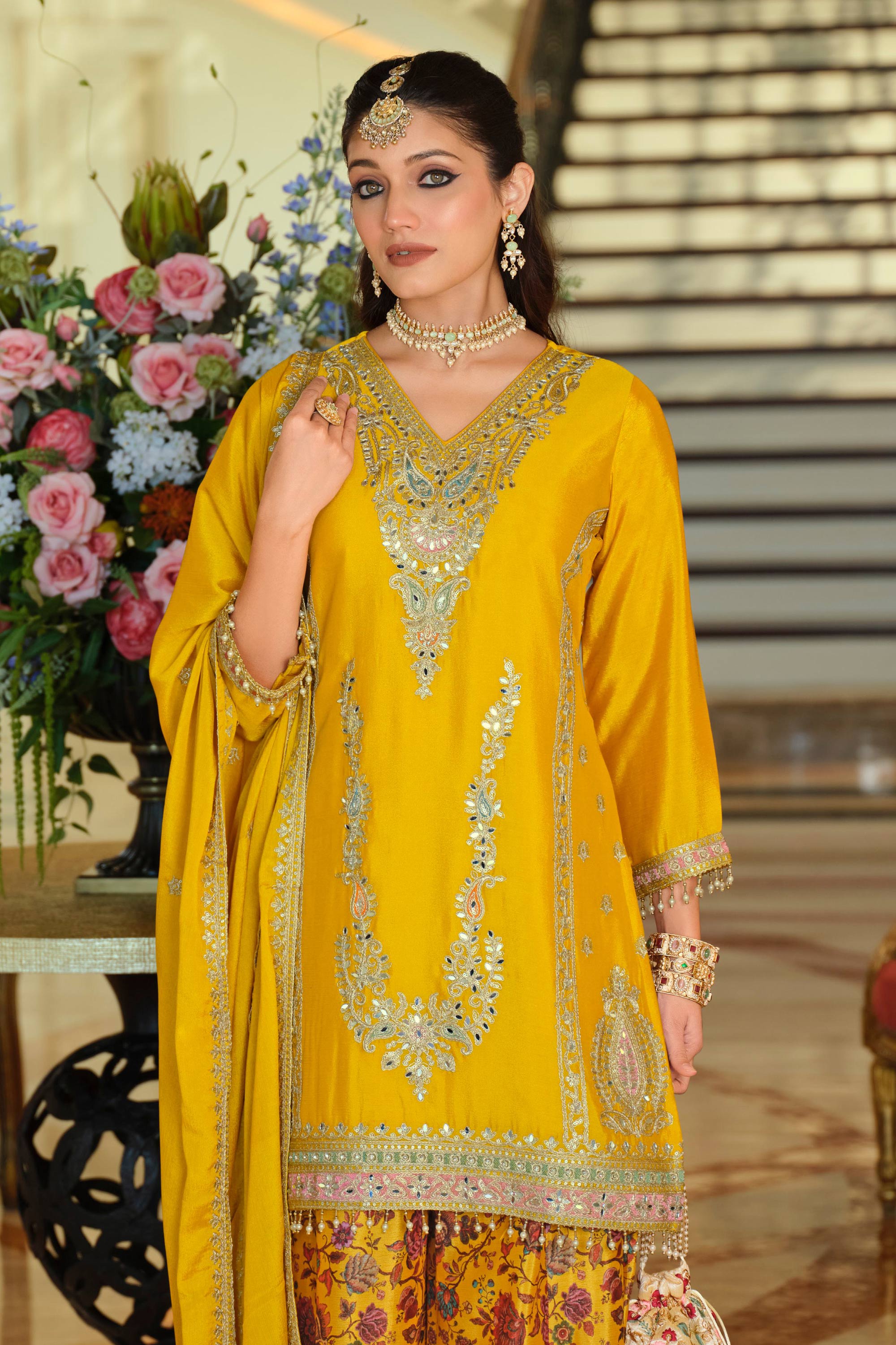Embroidered Chinon Yellow Readymade Palazzo Suit With Dupatta For Festive Wear
