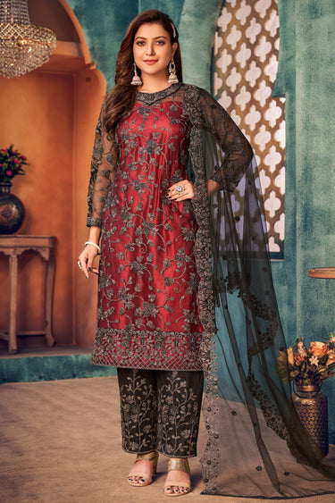 Embroidered Festive Wear Long Straight Cut Salwar Kameez In Net Fabric Maroon Color