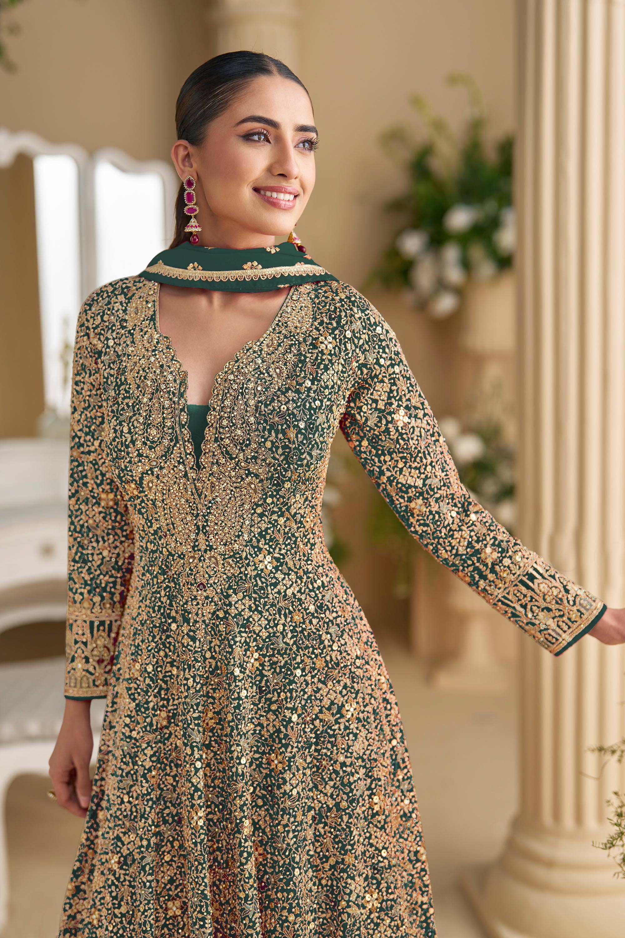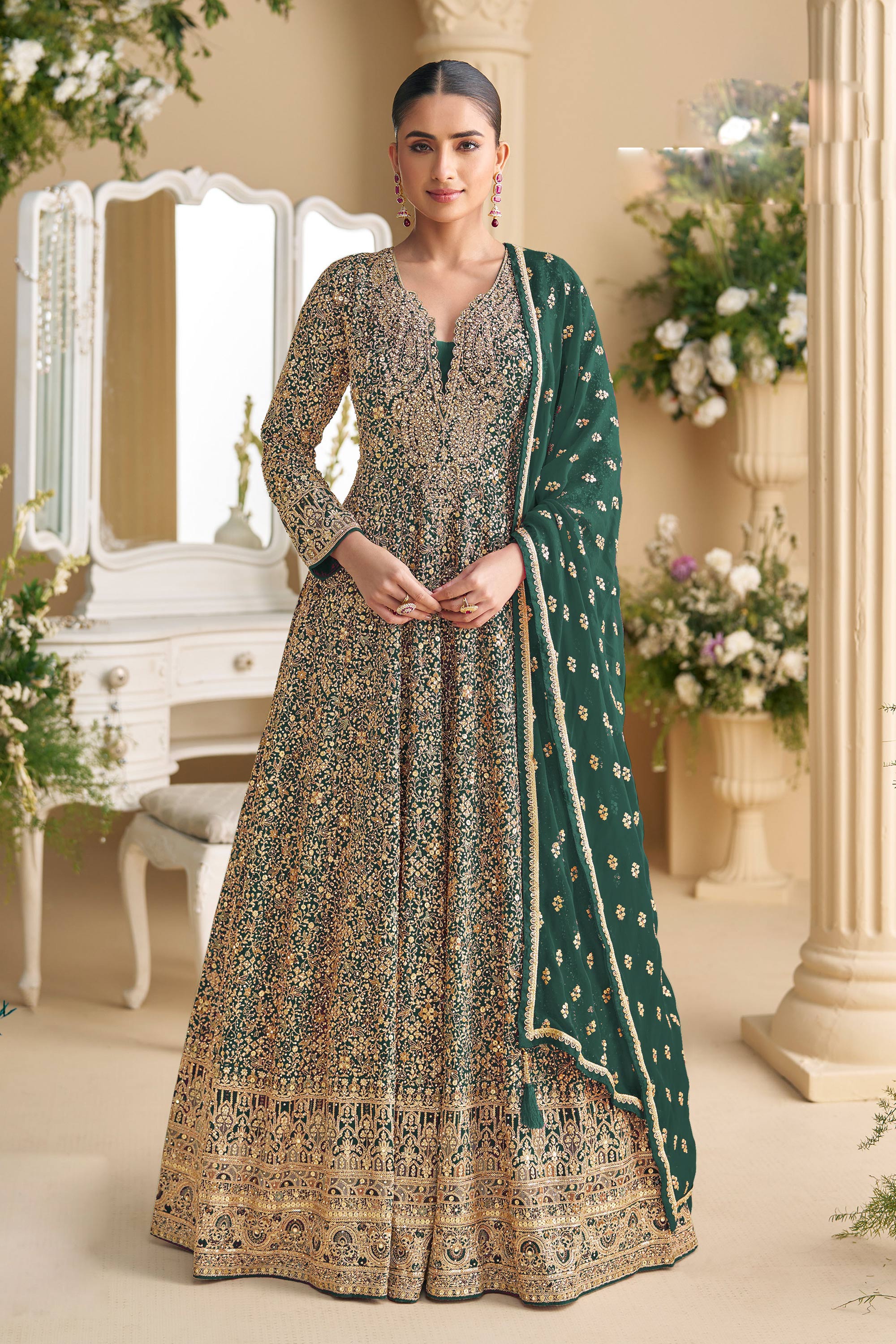 Embroidered Georgette Dark Green Readymade Anarkali Style Gown With Dupatta For Festive Wear