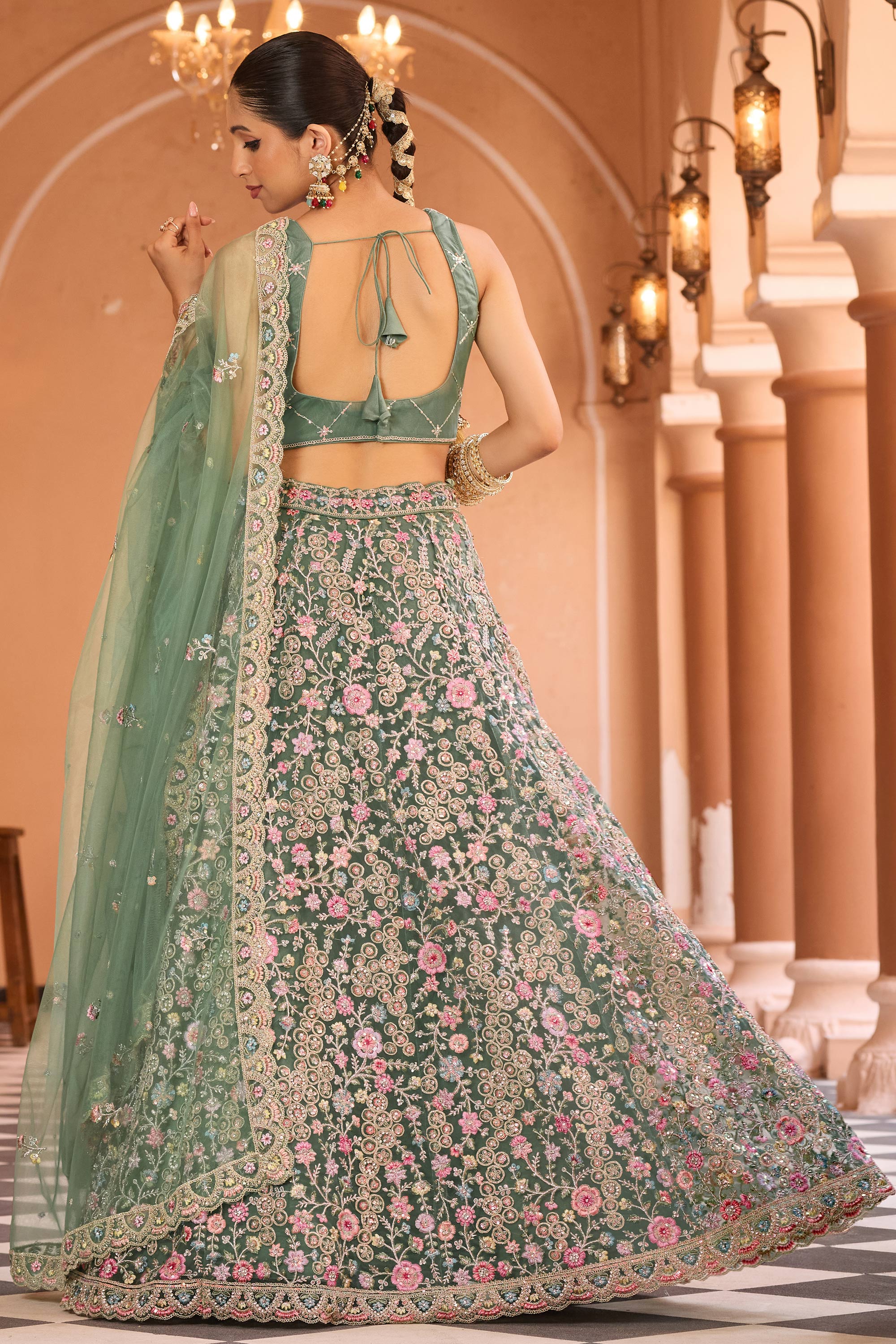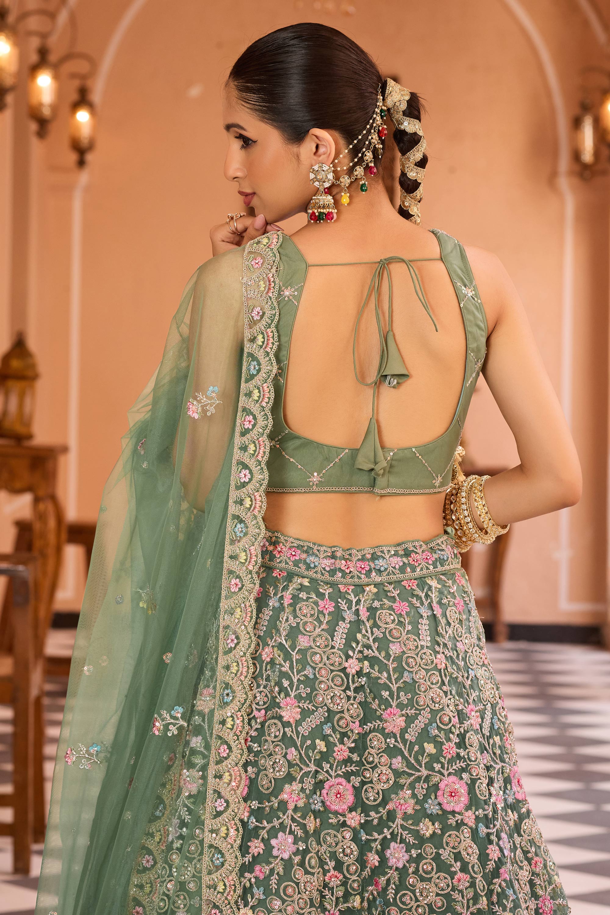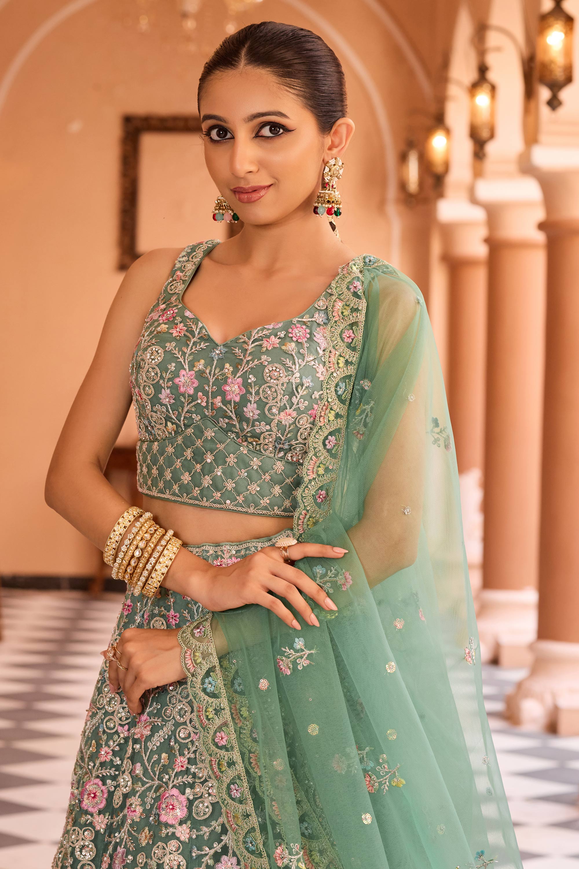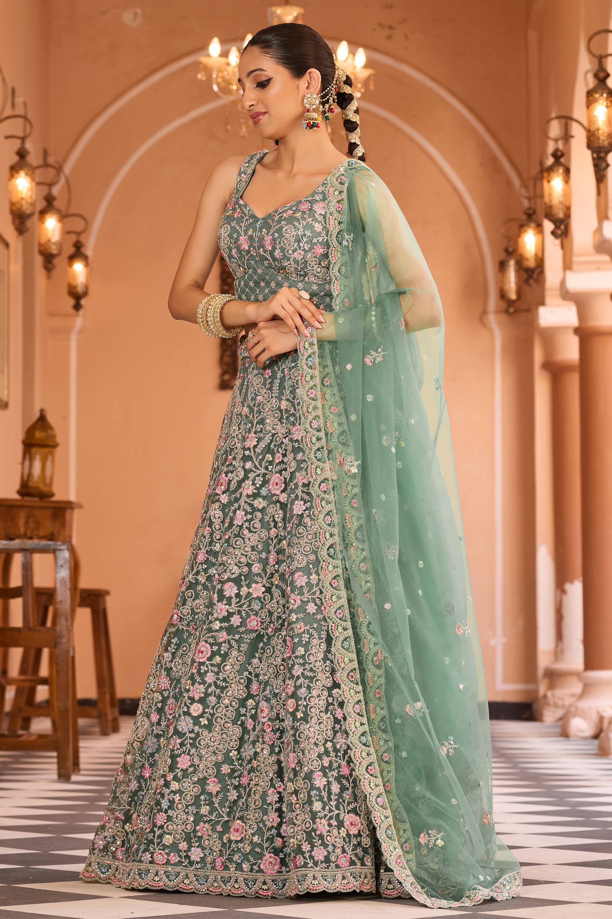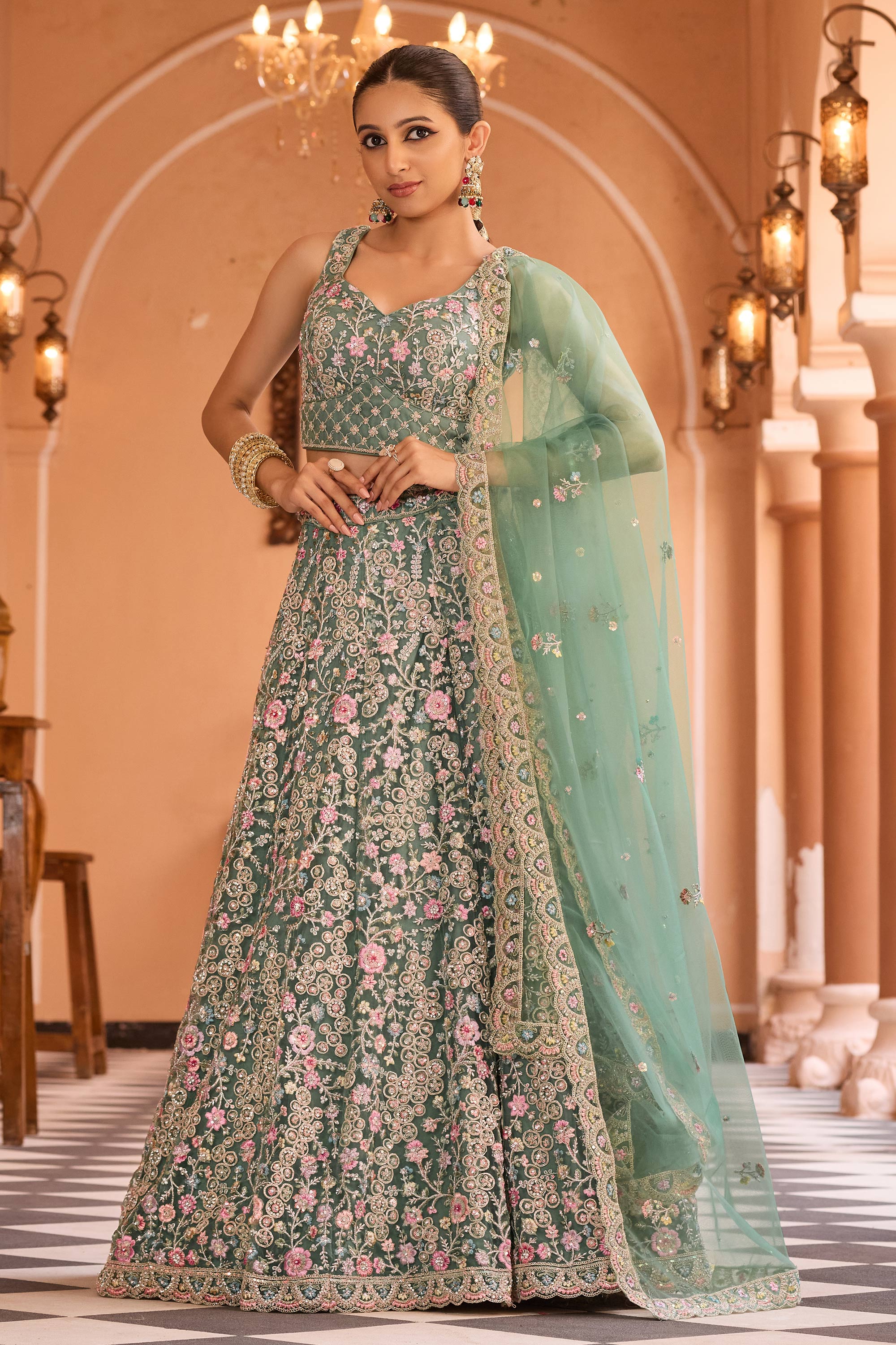 Embroidered Net Fabric Sea Green Lehenga Choli For Wedding Wear