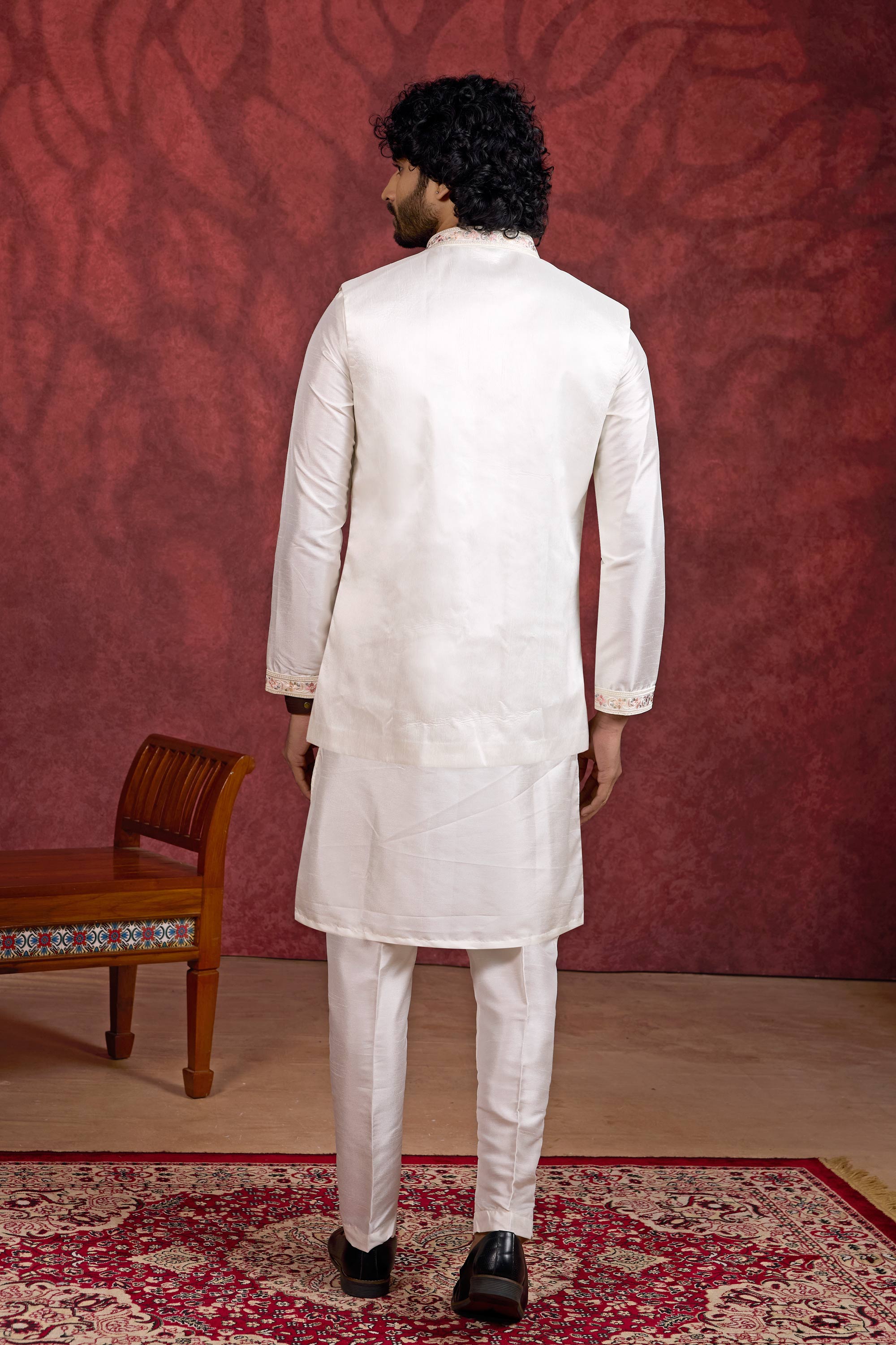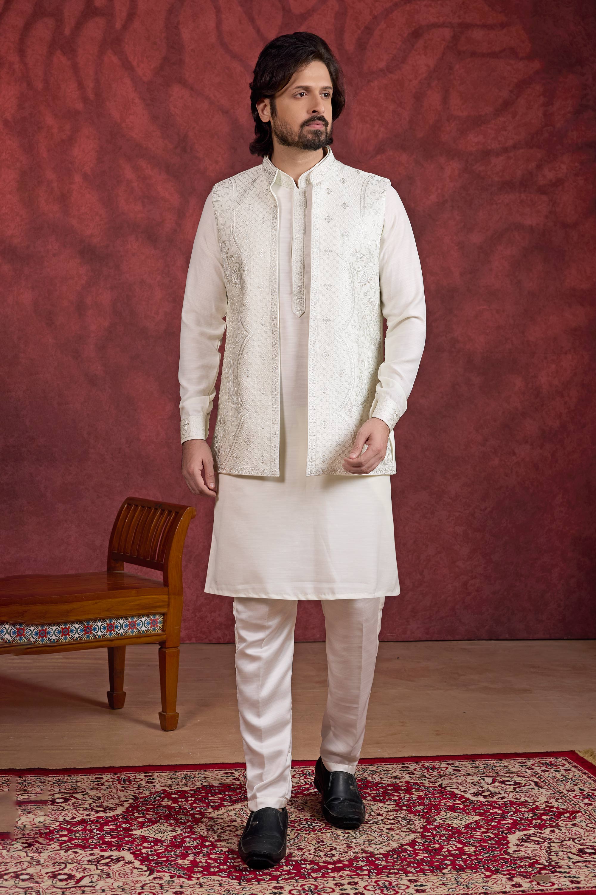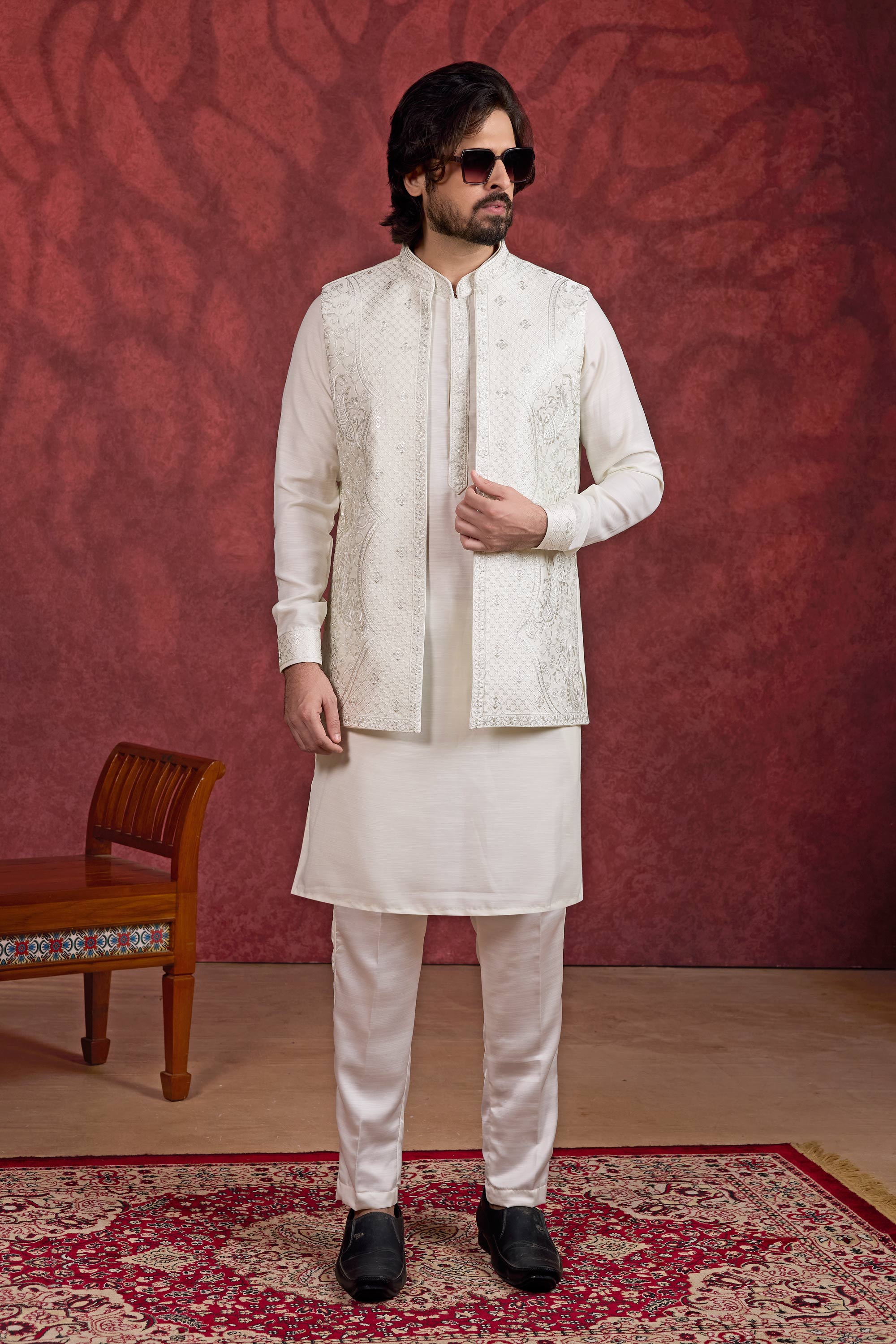 Embroidered Off White Function Wear Readymade Kurta Pyjama With Jacket For Men