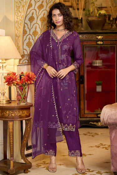 Embroidered Organza Fabric Readymade Straight Cut Suit In Purple Color