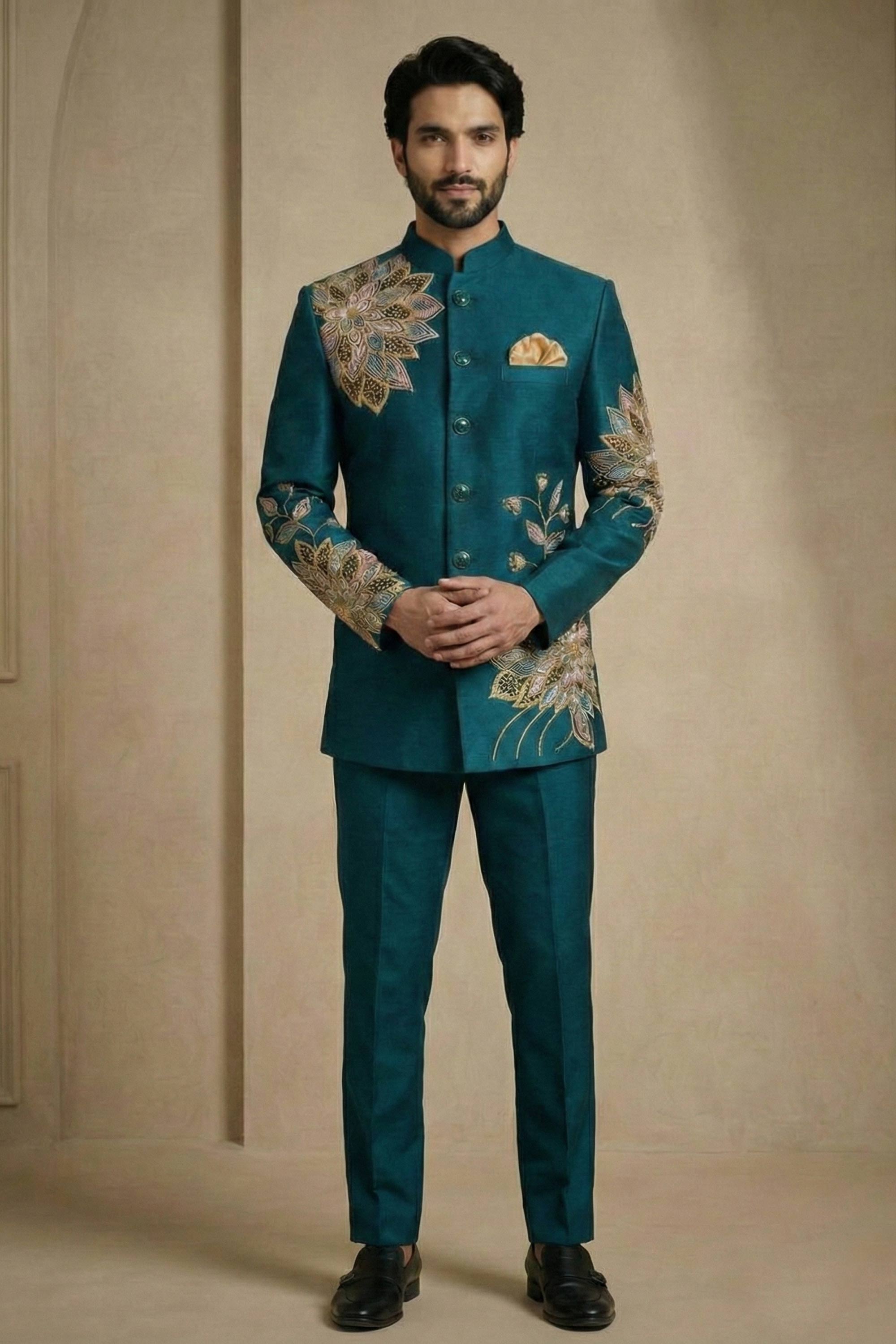 Embroidered Satin Silk Teal Sangeet Wear Readymade Jodhpuri Suit For Men