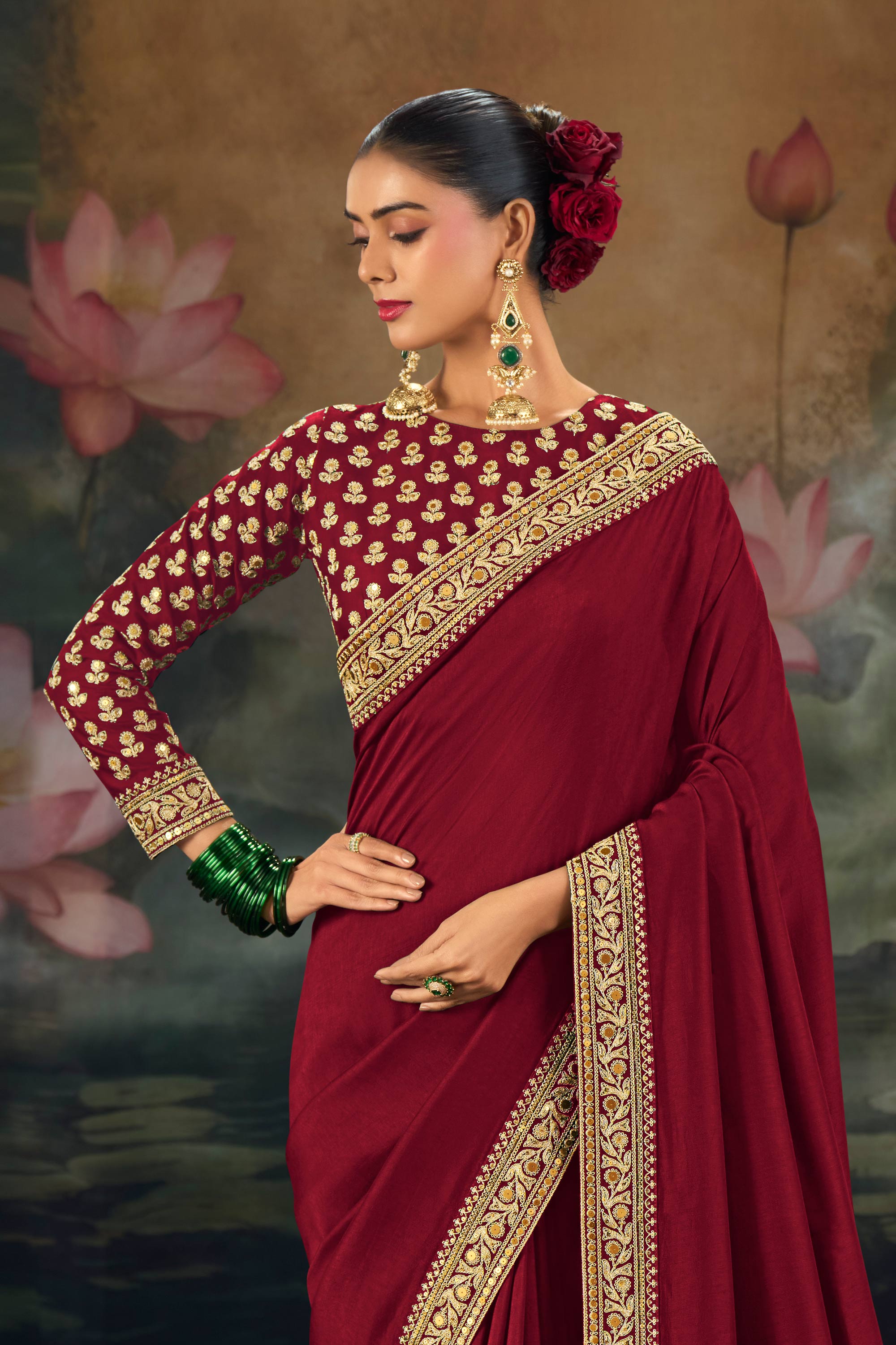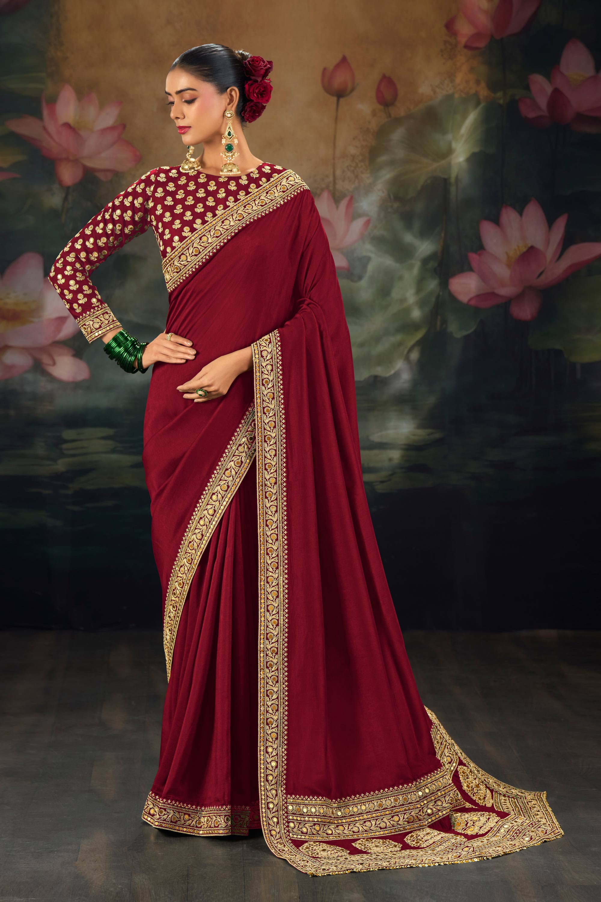 Embroidered Silk Maroon Saree For Sangeet Wear