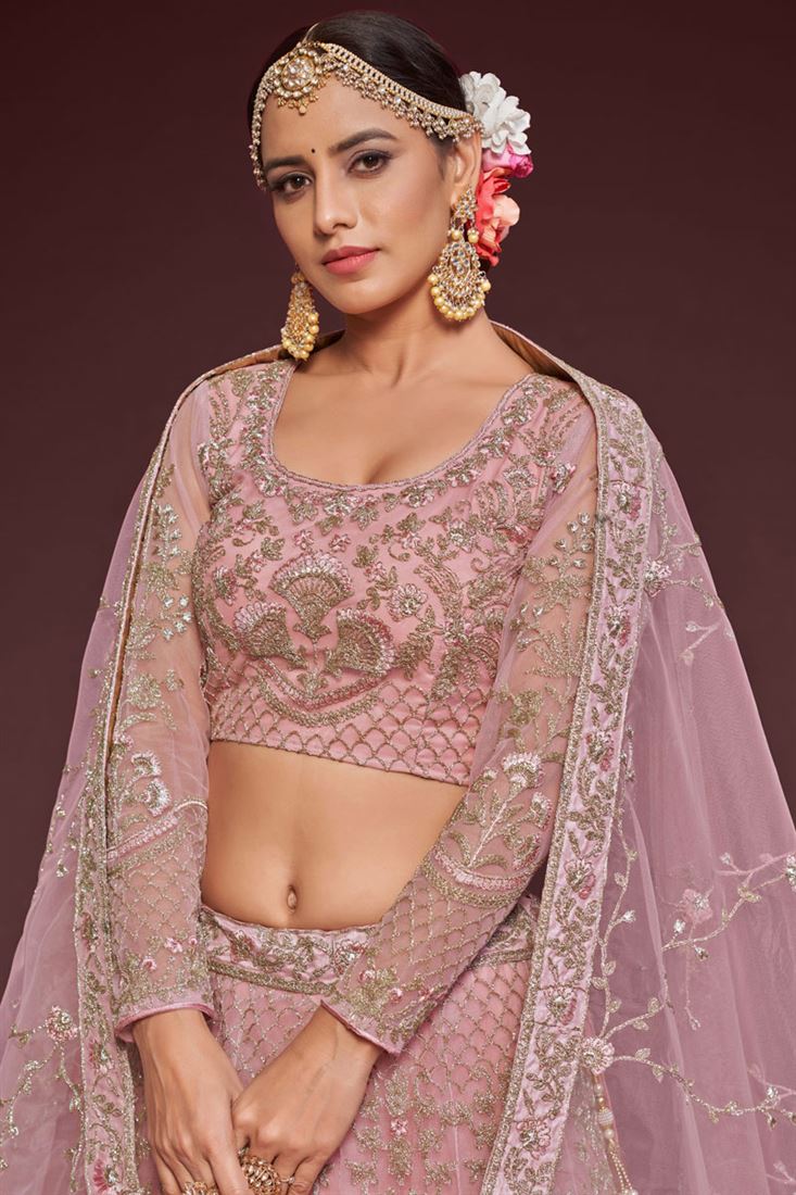 Embroidered Work On Glamorous Lehenga In Pink Color Net Fabric