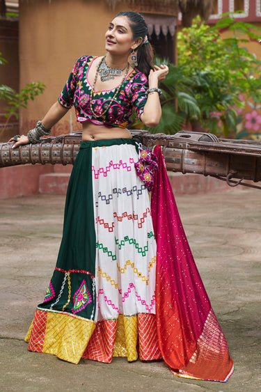 Dazzle in this Navratri Special Lehenga Choli by Reach Color, designed for the modern woman who appreciates traditional elegance. The readymade choli is available in a 38-inch size with customizable options up to 44 inches. The lehenga has a 42-inch waist and a 40-inch length, perfectly blending comfort with high fashion. This designer piece features elaborate embroidery that adds a rich and festive touch. Kindly note that the colors might slightly differ from the pictures due to photographic effects.
