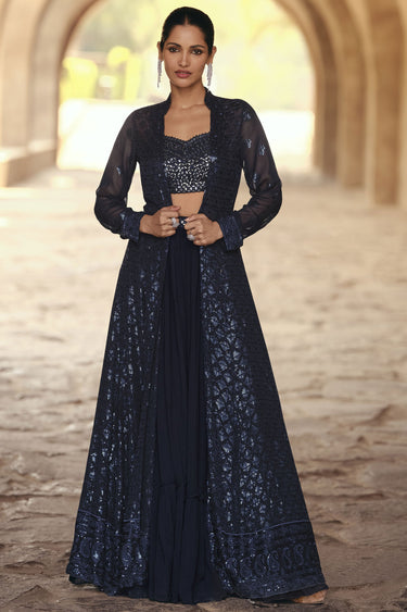 Embroidery Work Navy Blue Color Chinon Fabric Readymade Indo Western Lehenga Choli With Long Shrug