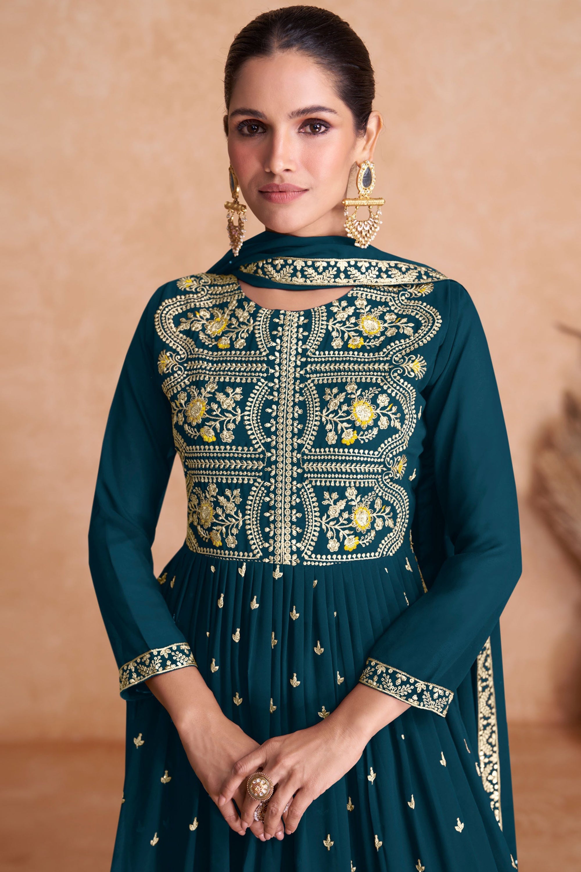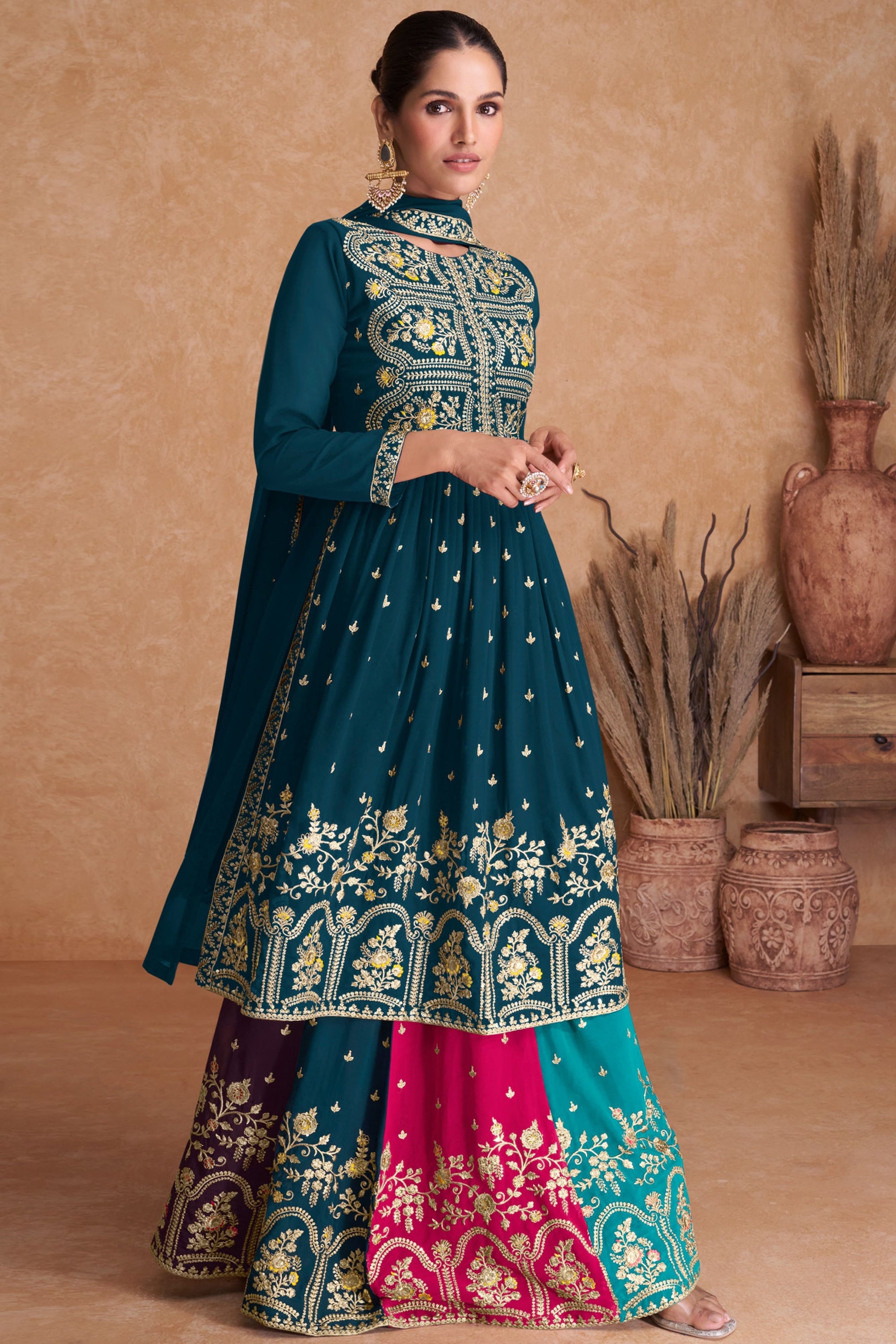 Embroidery Work On Teal Designer Sharara Style Readymade Lehenga In Georgette Fabric