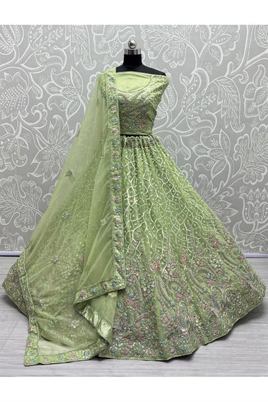 Engaging Green Color Net Fabric Heavy Look Embroidered Work Bridal Lehenga Choli