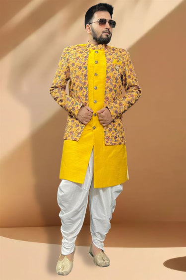 Enriching Yellow Color Silk Fabric Peshawari Style Indo Western Set