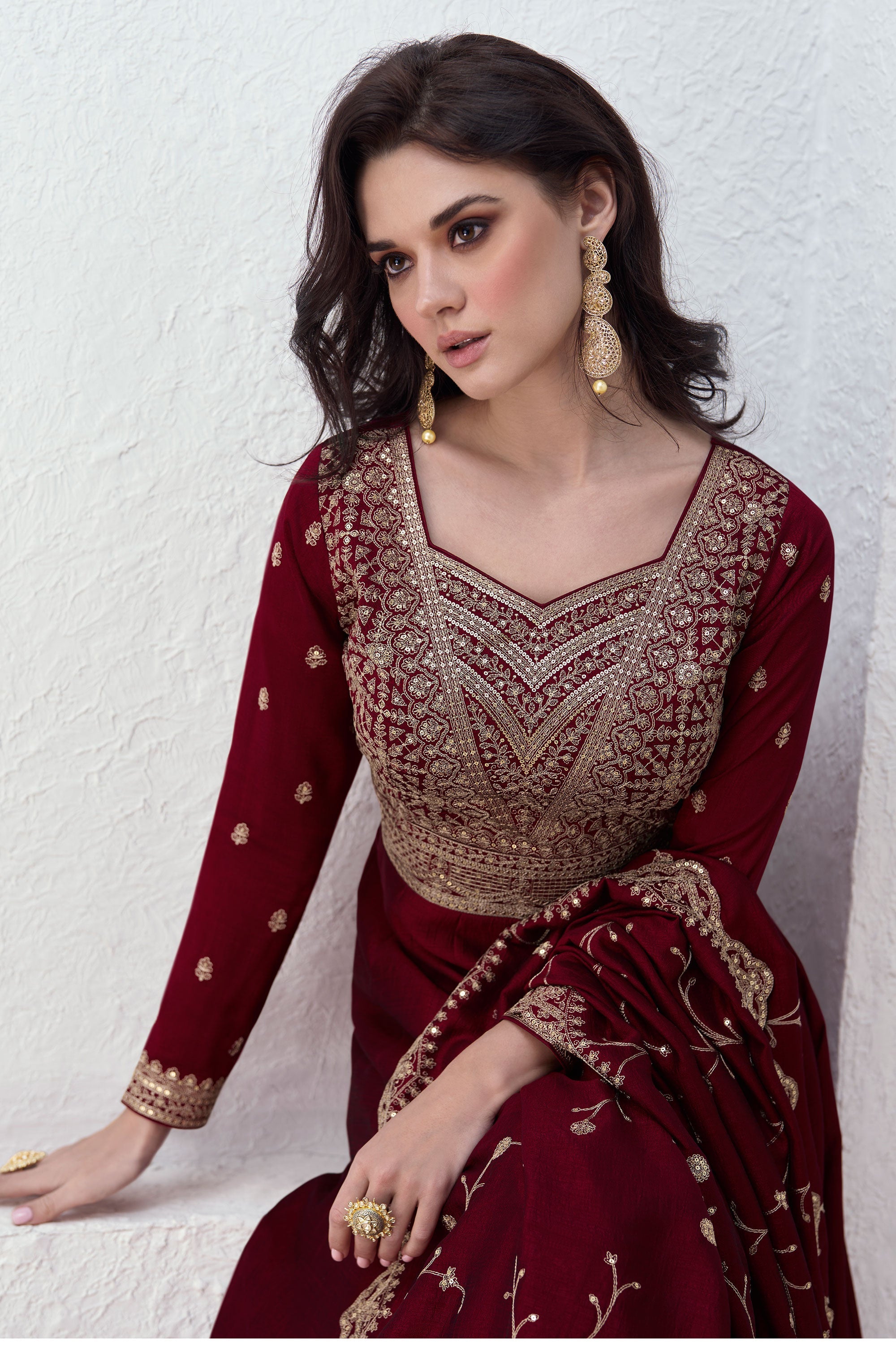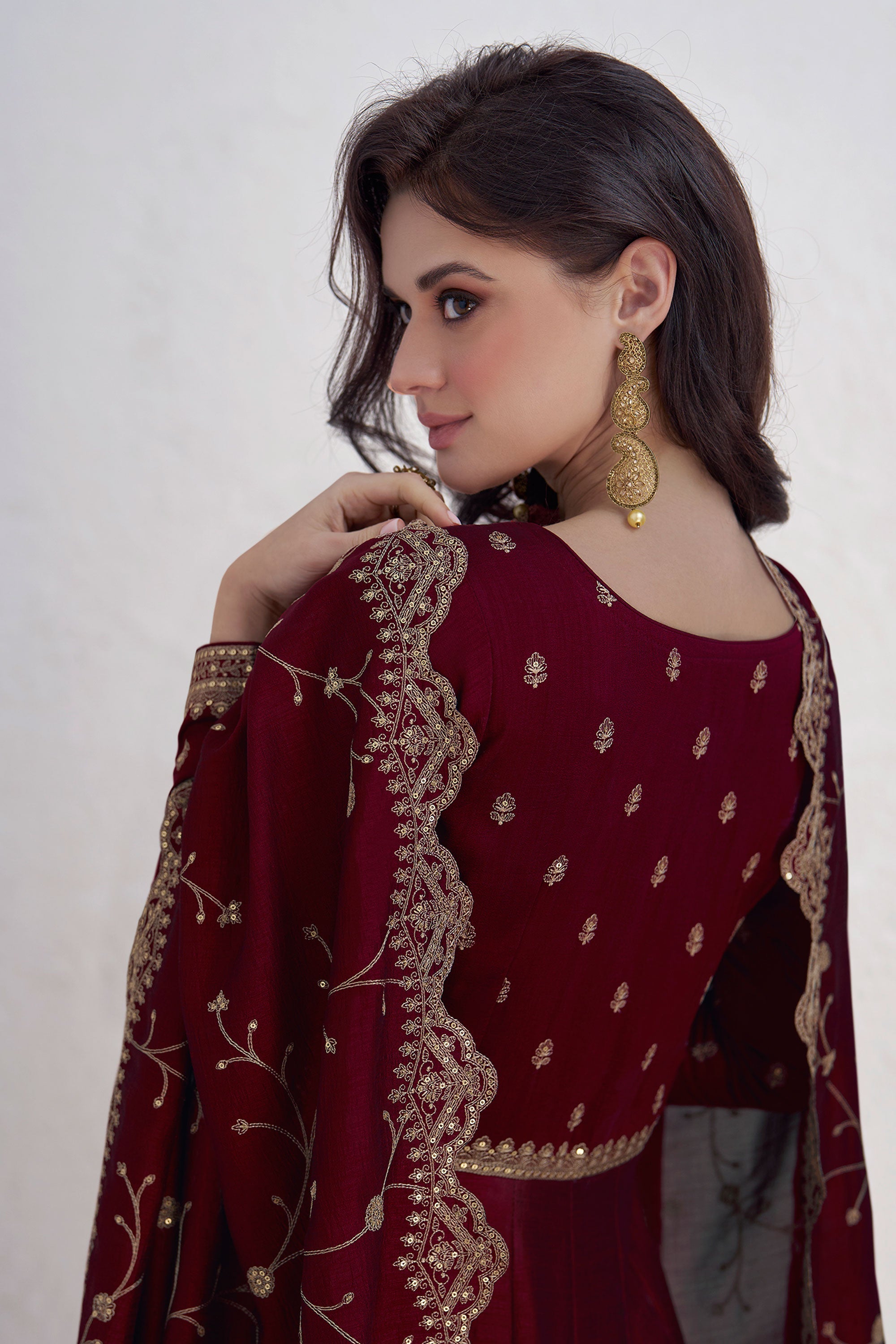 Eugeniya Belousova Maroon Color Captivating Readymade Gown With Dupata In Chinon Fabric