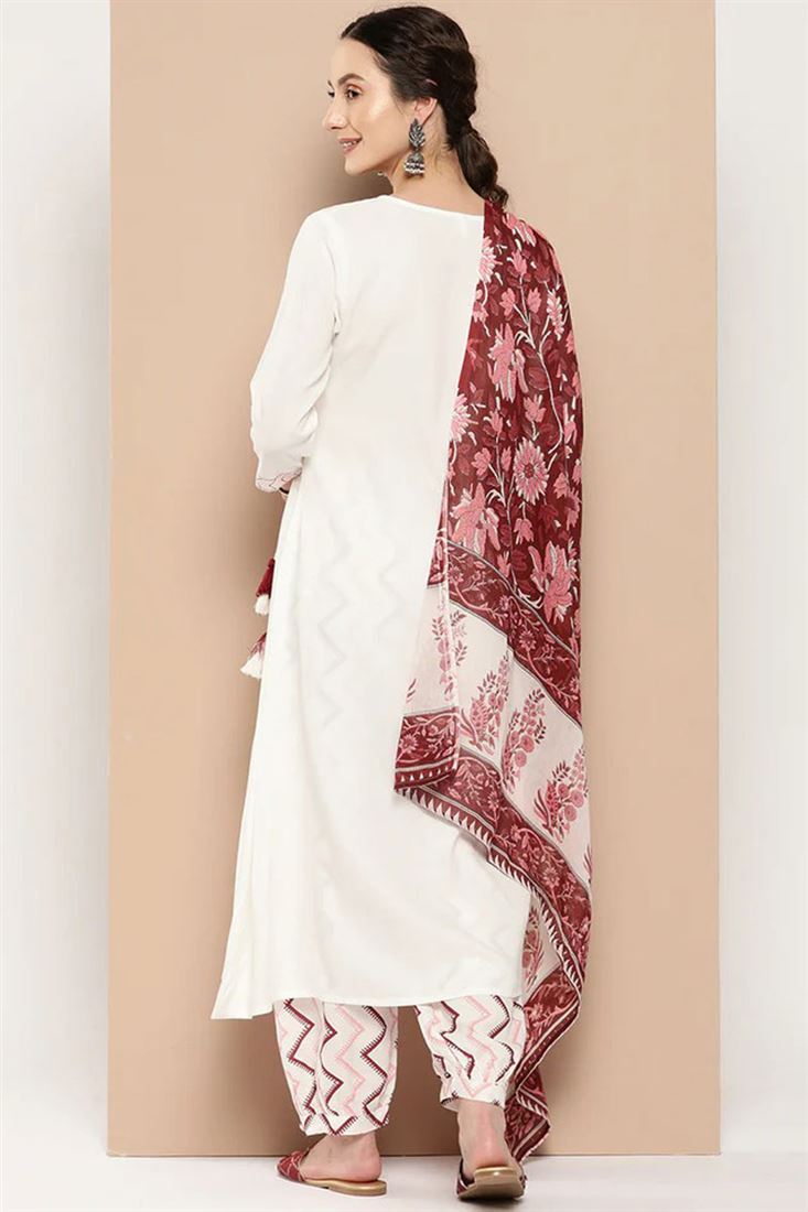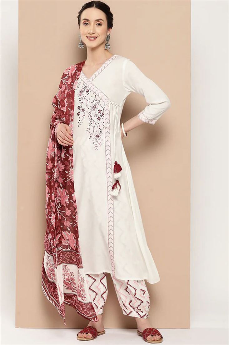 Excellent Rayon Fabric White Color Top Bottom Dupatta Set With Embroidered Work