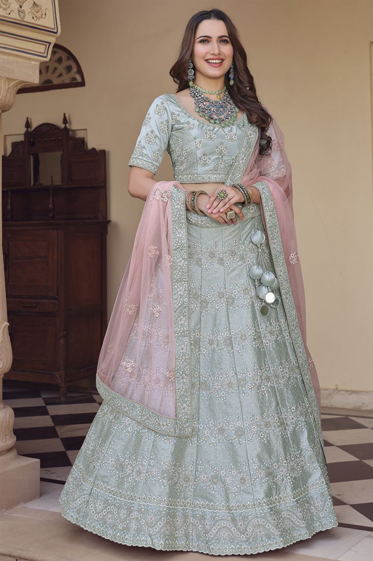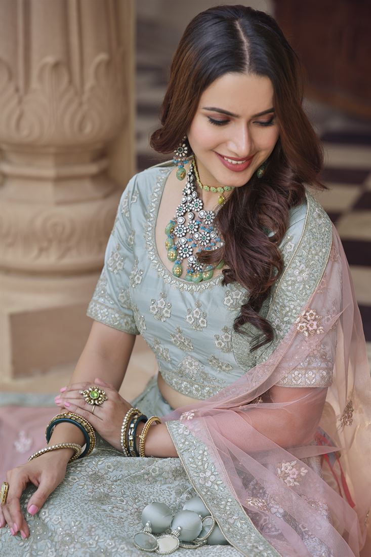 Exclusive Crepe Fabric Sangeet Wear Grey Color Lehenga With Embroidered Work
