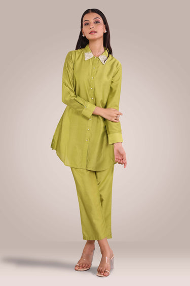 Elevate your wardrobe with this exclusive green cotton silk co ord set. Made from soft and breathable fabric, it offers a comfortable and relaxed fit that's perfect for any day wear. The solid plain design of the top and pants is simple yet stylish, featuring a shirt collar style with relaxed sleeves. Pair it with your favorite sneakers for a casual look or dress it up with some heels for a night out. With its high-quality material and excellent craftsmanship, this set will be your go-to outfit for any occasion.