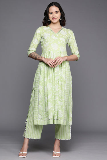 Exclusive Green Cotton Fabric Festive Wear Floral Printed Readymade Top With Bottom Set