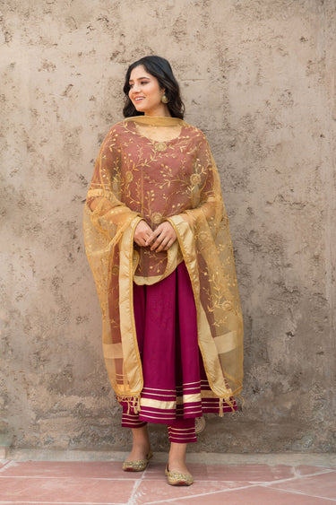 Exclusive Magenta Color Rayon Fabric Fancy Self Work Readymade Top With Bottom Dupatta Set