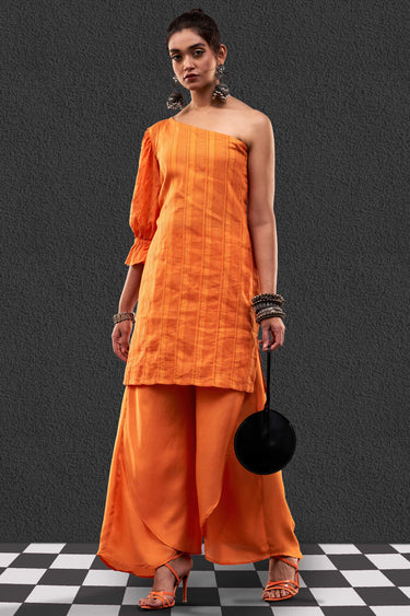 Get ready to be the center of attention with our Exclusive Orange Color Cotton Jacquard Fabric Party Wear Designer Readymade Fusion Kurta Set. Stand out from the crowd in our unique one shoulder cotton stripe kurta, featuring a poet sleeve design for an added touch of elegance. Paired with solid draped palazzo, this set is perfect for any party or special occasion. The high-quality cotton jacquard fabric provides both comfort and durability, making it suitable for all-day wear. And with its eye-catching Piñata orange color, you are sure to turn heads wherever you go! Be a trendsetter and upgrade your wardrobe with this must-have fusion kurta set today!
