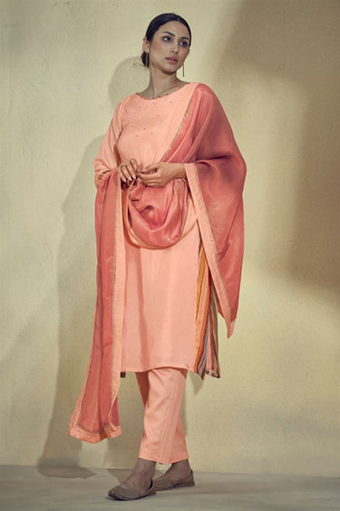 Exclusive Peach Art Silk Fabric Festive Wear Stylish Panelled Straight Cut Suit