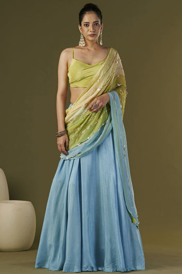 The Exclusive Sky Blue Color Art Silk Fabric Embroidered Work Party Wear Designer Readymade Lehenga Saree is a stunning work of art. This unique and elegant lehenga saree comes in an enchanting sky blue color that is perfect for any party or formal occasion. The beautiful ombre pallu complements the hand-embroidered detailing, which includes pearls, beads, cowrie shells and other delicate touches that truly make this piece stand out. The accompanying cowl neck blouse pairs perfectly with the intricate design of the lehenga saree, creating an overall sophisticated look that exudes grace and charm. Crafted with high-quality materials and careful attention to detail, this designer piece will undoubtedly impress all who lay eyes on it. Make a statement at your next event with this one-of-a-kind ensemble that celebrates both timeless elegance and modern style!