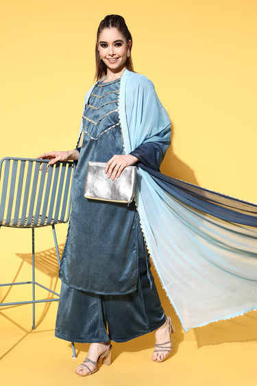Exclusive Velvet Fabric Teal Color Readymade Kurti Bottom Set