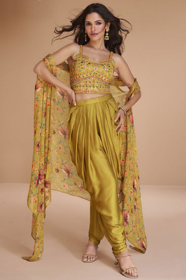 Faded Yellow Color Satin Silk Fabric Embroidered Readymade Indo Western Dhoti Suit With Shrug