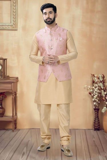 Fancy Cream Color Art Silk Fabric Function Wear Readymade Kurta Pyjama For Men With Modi Jacket Set