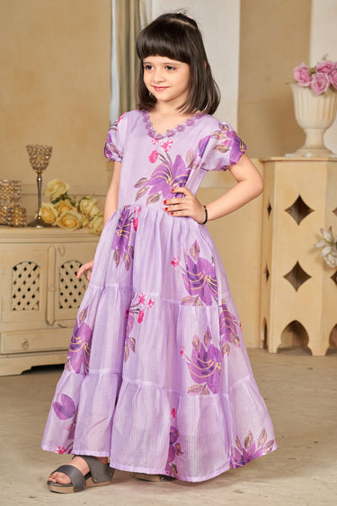 Fancy Fabric Engaging Lavender Color Function Wear Digital Printed Readymade Kids Gown