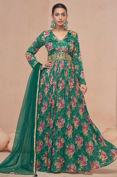 Fancy Fabric Magnificent Readymade Digital Printed Gown With Dupatta In Green Color