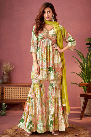 Fancy Fabric Printed Readymade Sharara Palazzo Suit In Multi Color