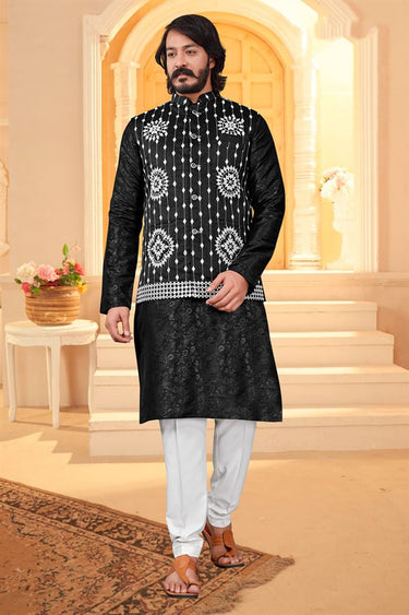 Fascinate Black Color Art Silk Fabric Function Wear Readymade Kurta Pyjama With Fancy Jacket