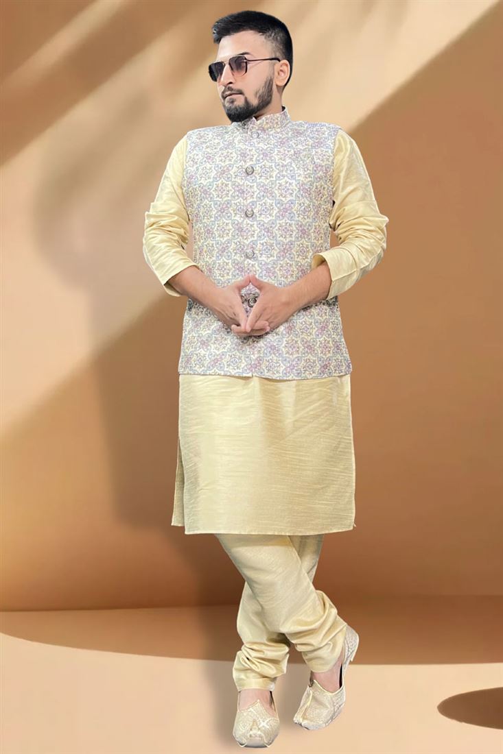 Fascinate Silk Fabric Function Wear Cream Kurta Pyjama With Cream Color Jacket