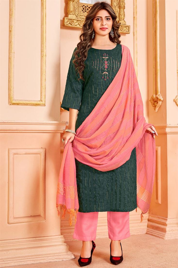 Festival Wear Dark Green Color Salwar Kameez With Color Contrast Dupatta