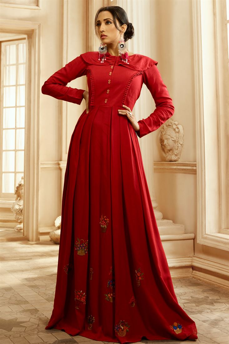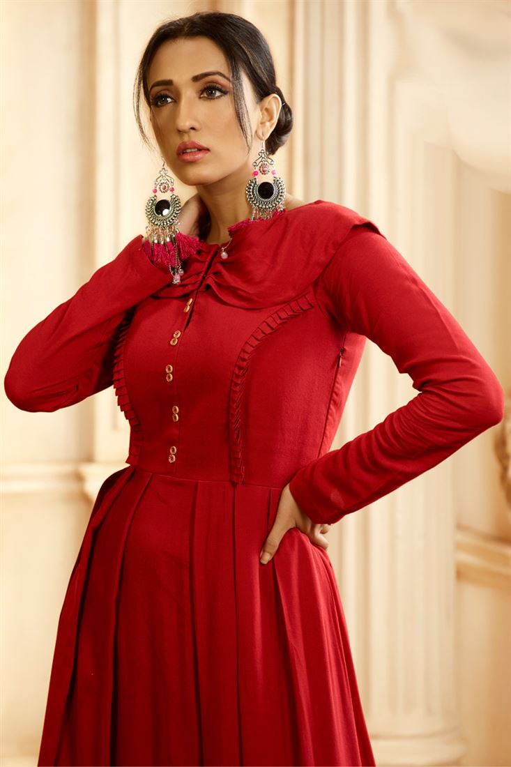 Festive Rayon Cotton Gown Style Kurti in Vibrant Red Color
