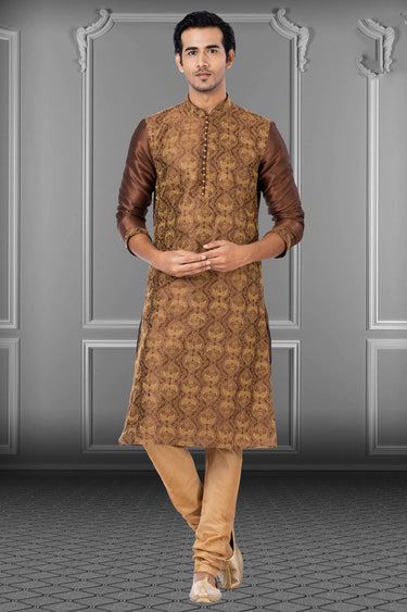 Festive Wear Readymade Kurta Pyjama For Men In Brown Dhupion Fabric