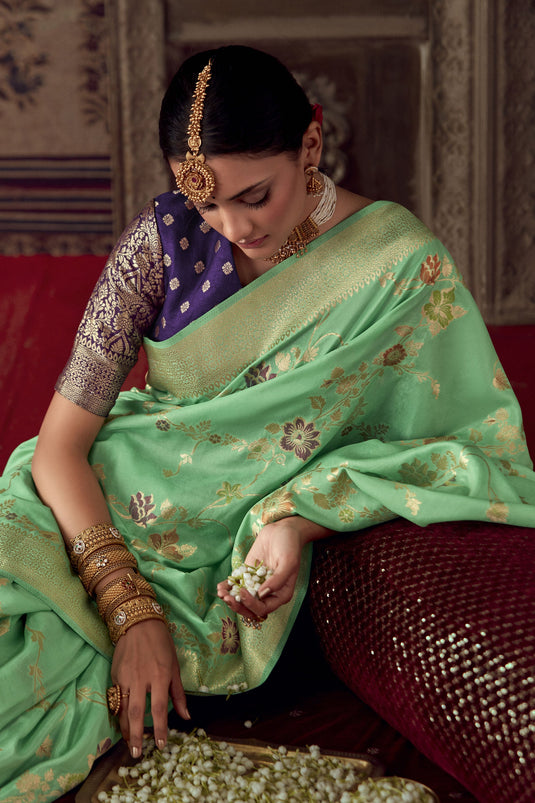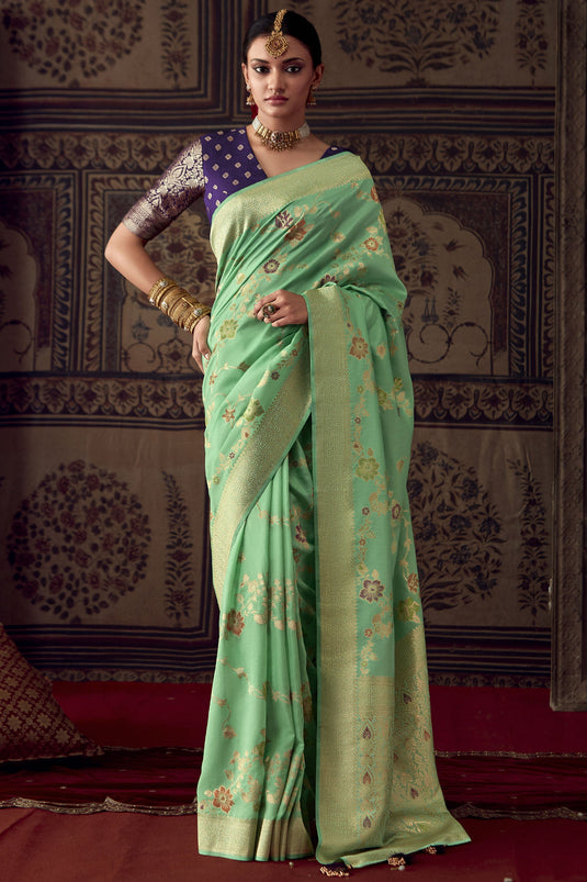 Function Wear Fancy Fabric Weaving Work Saree In Sea Green Color