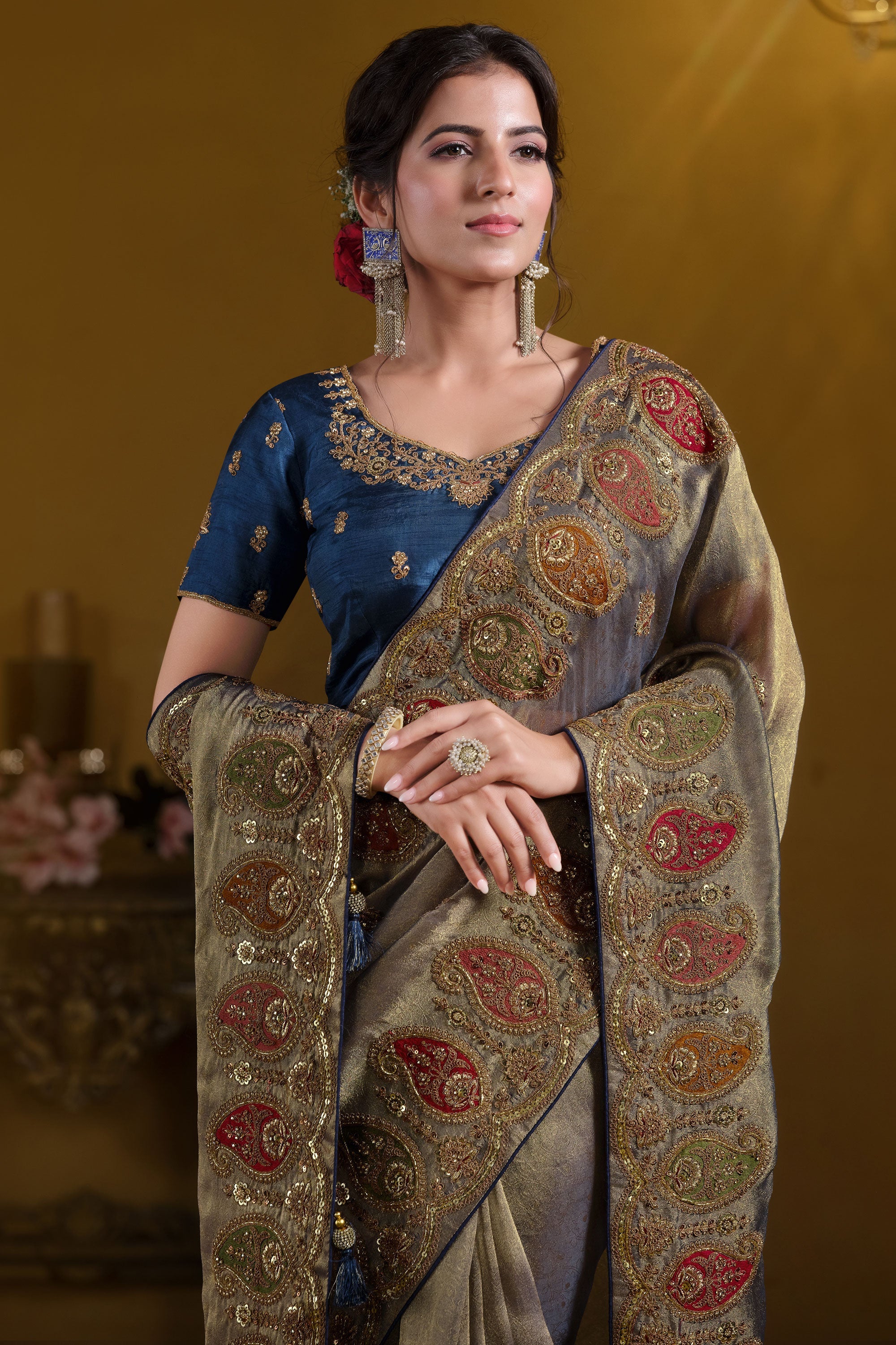 Georgette And Organza Silk Luxurious Sequins Work Saree In Teal Blue Color