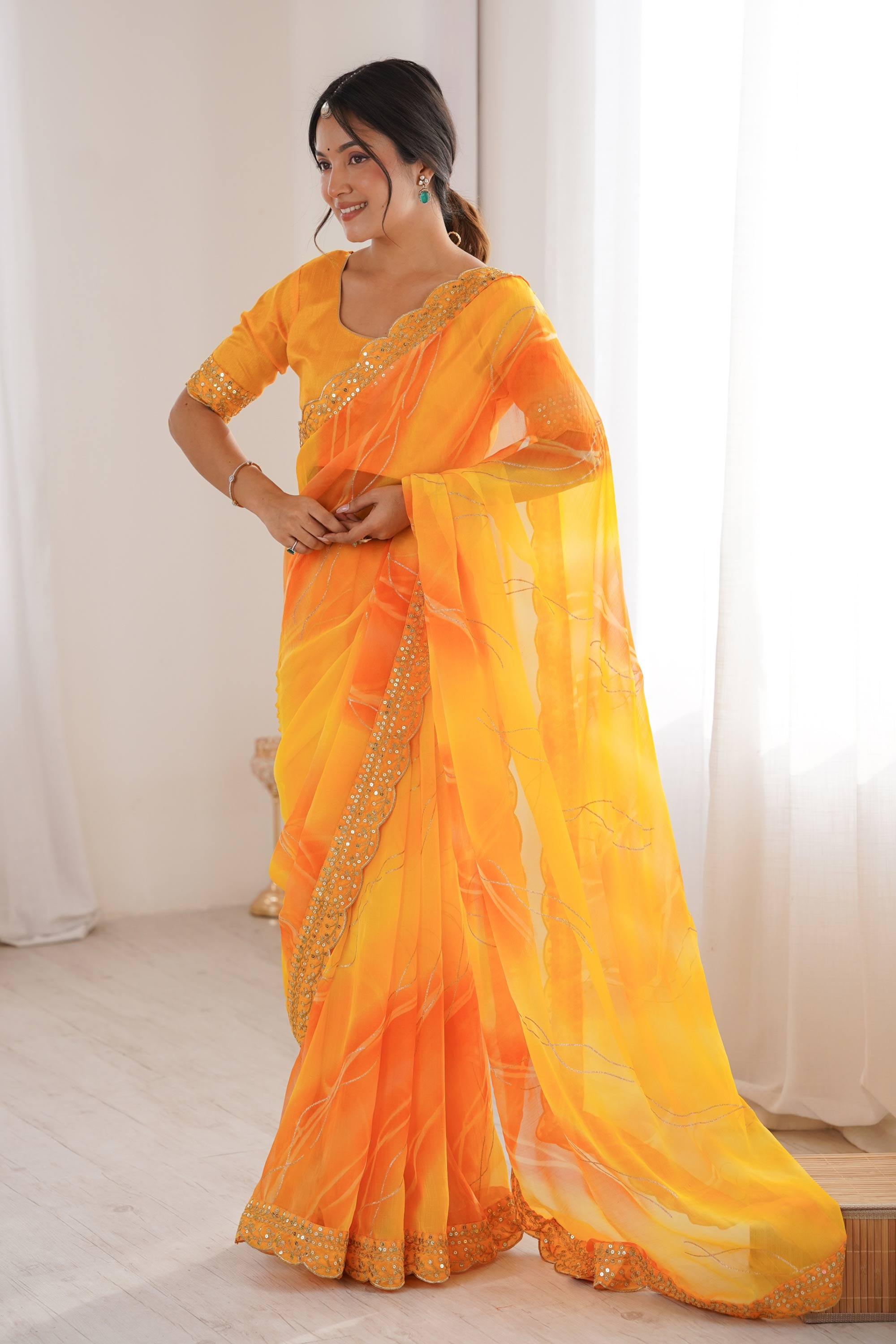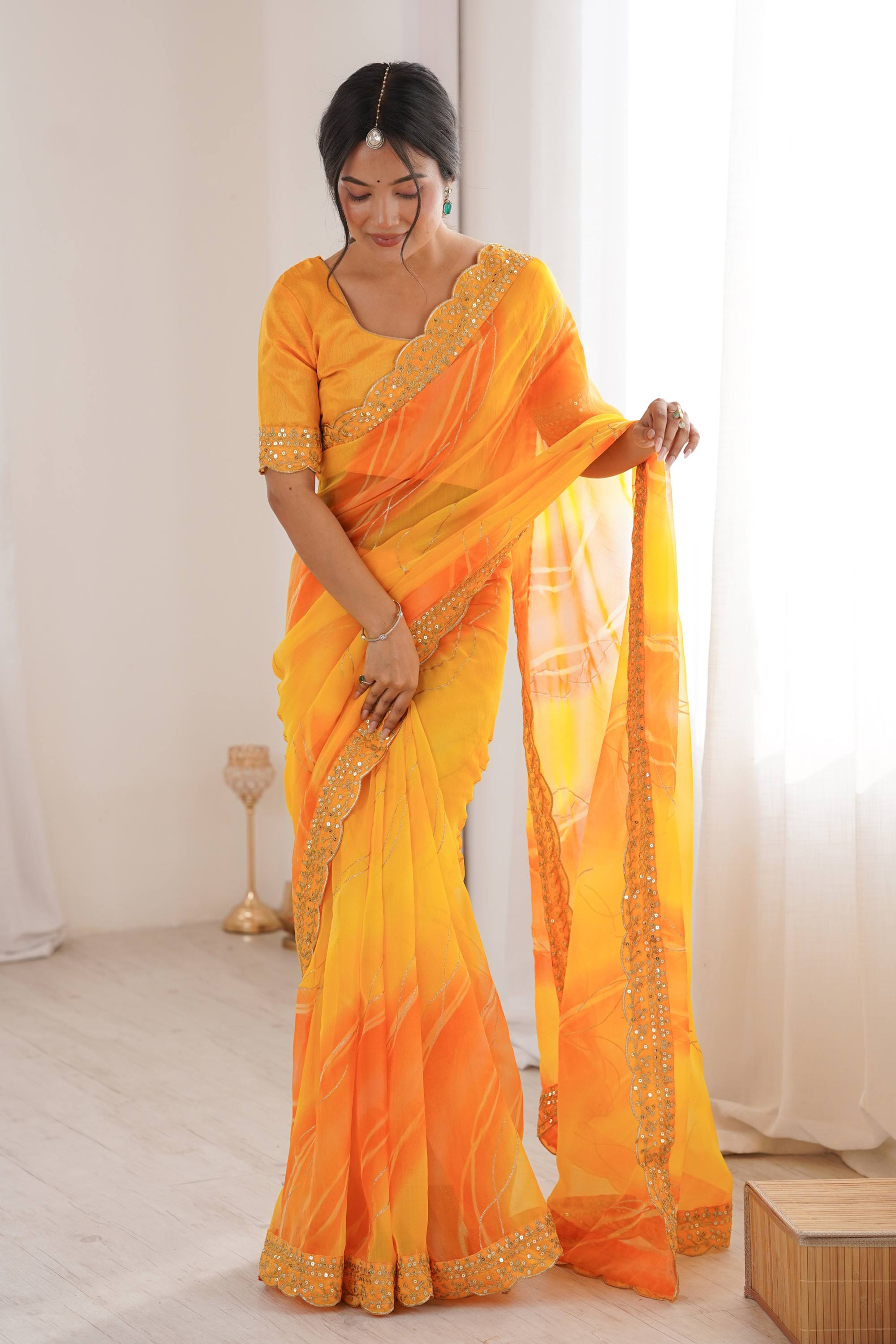 Georgette Chiffon Yellow Border Work Saree For Party Wear
