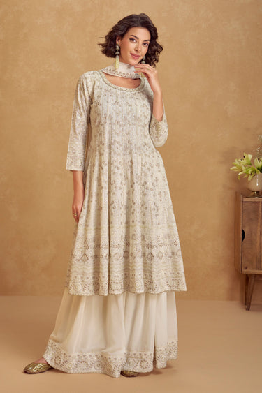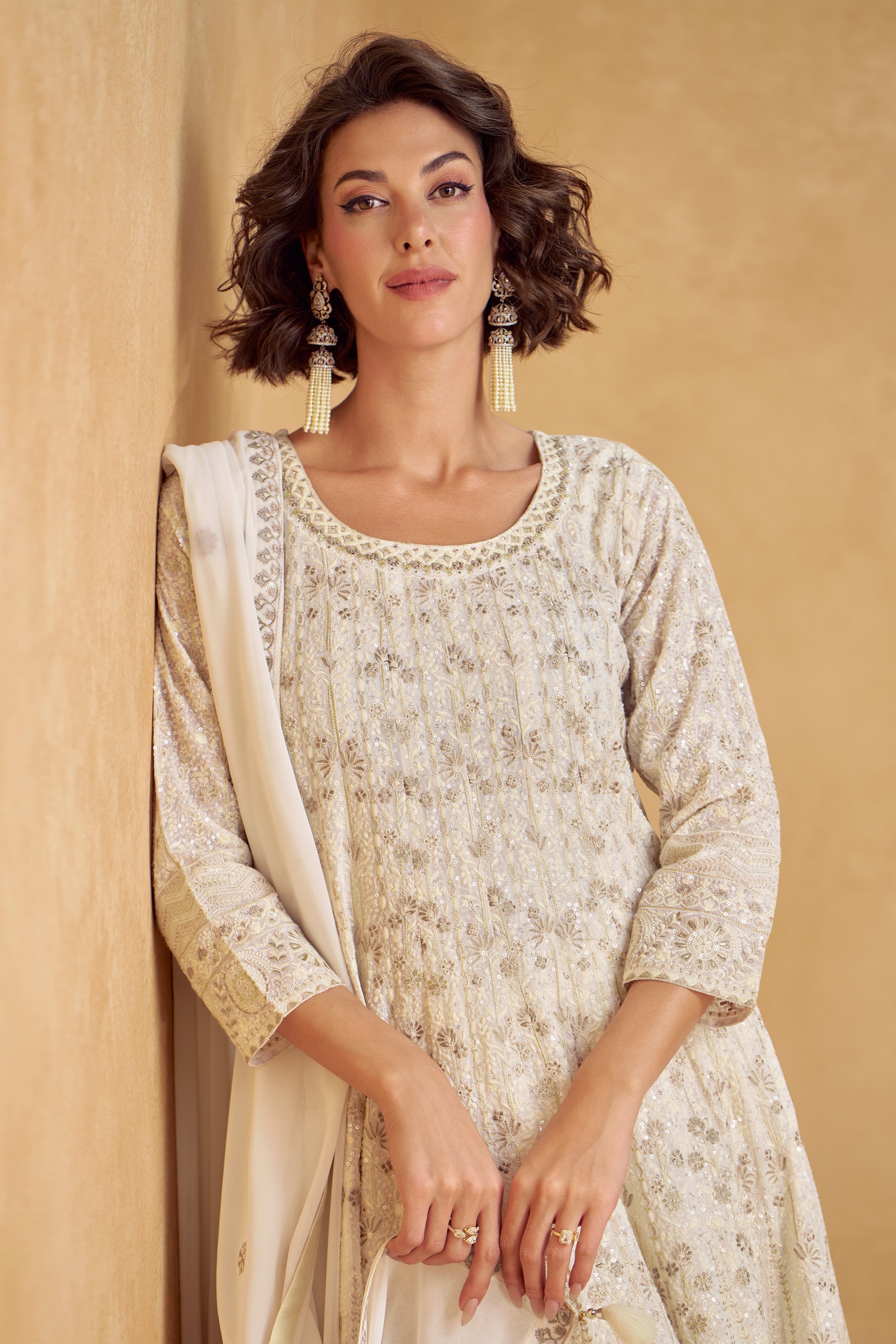 Experience the timeless elegance of our Georgette Embroidered Off White Designer Salwar Kameez. This outfit beautifully blends traditional craftsmanship with contemporary fashion. The soft georgette fabric ensures a comfortable fit while intricate embroidery adds a touch of sophistication. Perfect for festive occasions, weddings, or family gatherings, this ensemble is sure to make you stand out. Complete your look with traditional jewelry and a pair of chic heels to make a lasting impression.